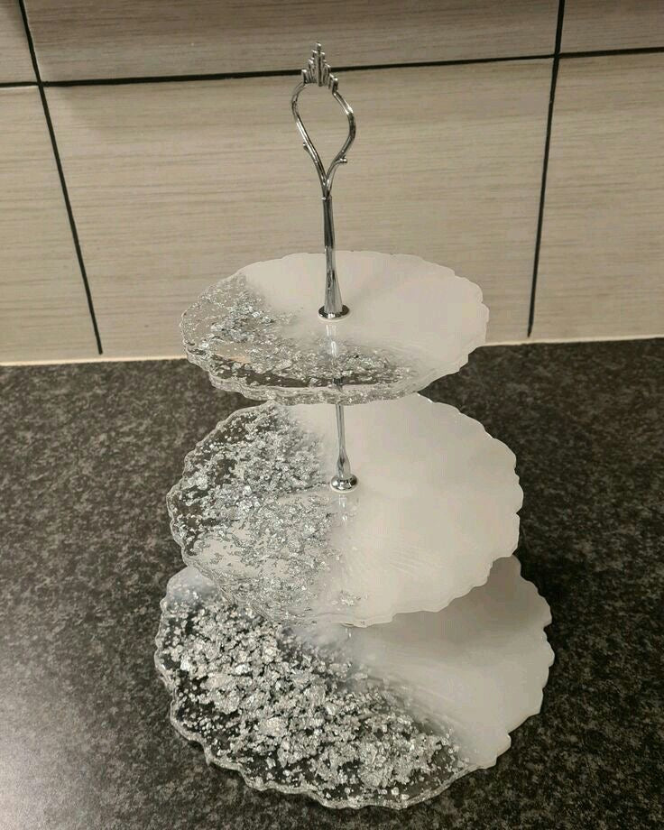 Our 3-Tier Cake Stand is made of Resin Epoxy, Pigment, Gold flakes, Metallic gold sketch pen for the outline, made in resin molds, Handcraft, 100% Waterproof, and Washable, long-lasting, and Durability, while the additional screws and pillars remain metallic. the bearing capacity of this coaster is up to 10 kg.