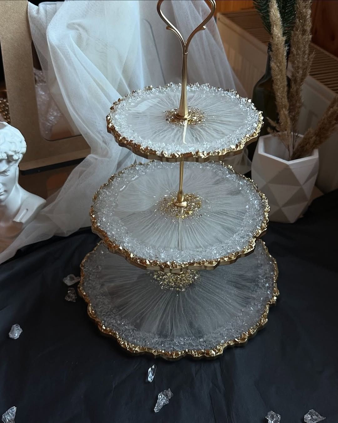 Our 3-Tier Cake Stand is made of Resin Epoxy, Pigment, Gold flakes, Metallic gold sketch pen for the outline, made in resin molds, Handcraft, 100% Waterproof, and Washable, long-lasting, and Durability, while the additional screws and pillars remain metallic. the bearing capacity of this coaster is up to 10 kg.