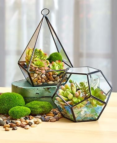 Home grown. These geometric terrariums are great for showcasing air plants, succulents, or cacti. Make a living diorama for your dresser or a conversation piece for your countertop.