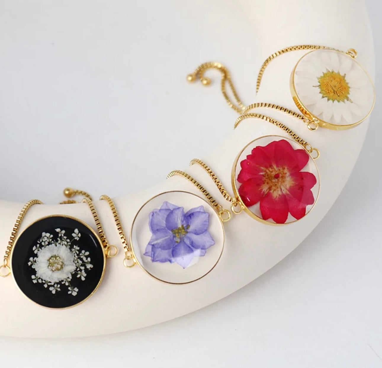 Note: Dear valued customer, we want to let you know that each bracelet in our collection is uniquely handcrafted and may vary slightly from the product photos. This is because we use real flowers in our designs, and each flower has its own distinct characteristics and beauty. Rest assured that each bracelet is made with the same attention to detail and care, and we believe that these variations only add to the charm and uniqueness of your piece. Thank you for choosing our preserved flower resin jewellery, and we hope you love your one-of-a-kind creation as much as we do!