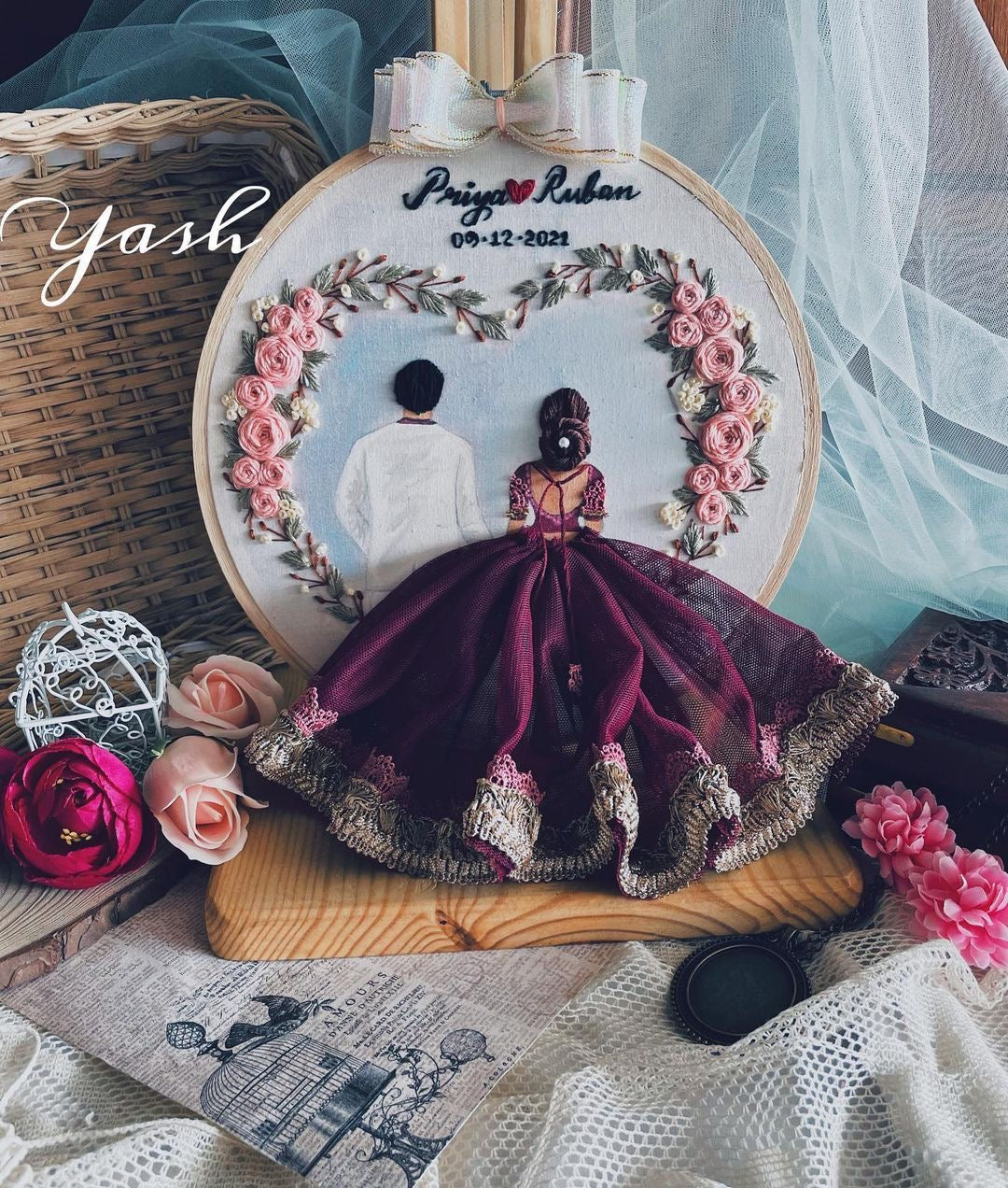 Crafted and personalized to perfection, our Customised Embroidered Wedding Hoops are the perfect way to add a unique touch to your home. Made with high-quality materials and hand-stitched with precision, these hoops are a beautiful addition to any space and can be gifted on events like Weddings/Anniversaries. Make your wedding dates memorable with these intricately embroidered Bride & Groom Wall hanging. You can customize the couple's name and date on it and gift it your loved one in a unique way for an anniversary or wedding gift.