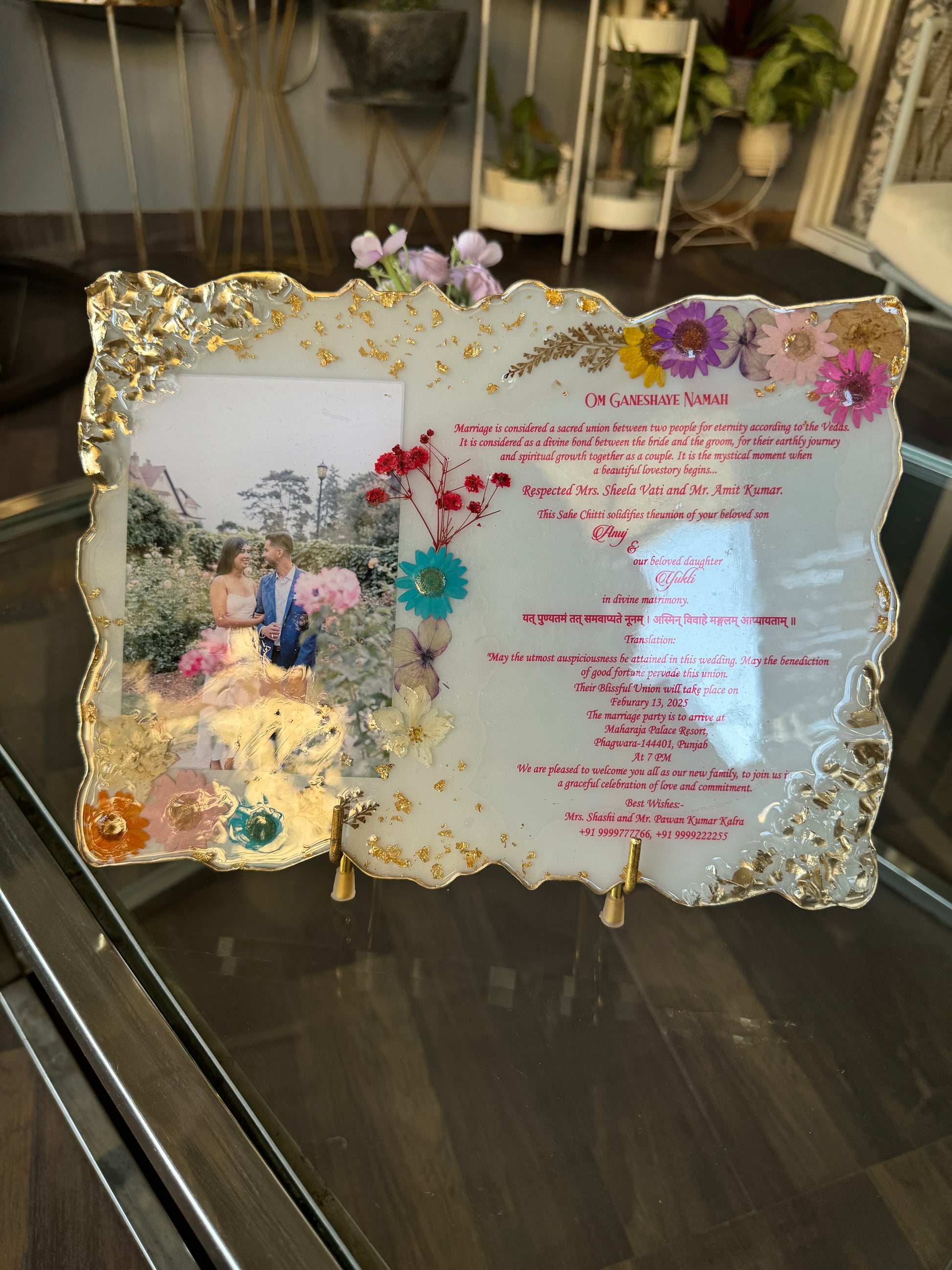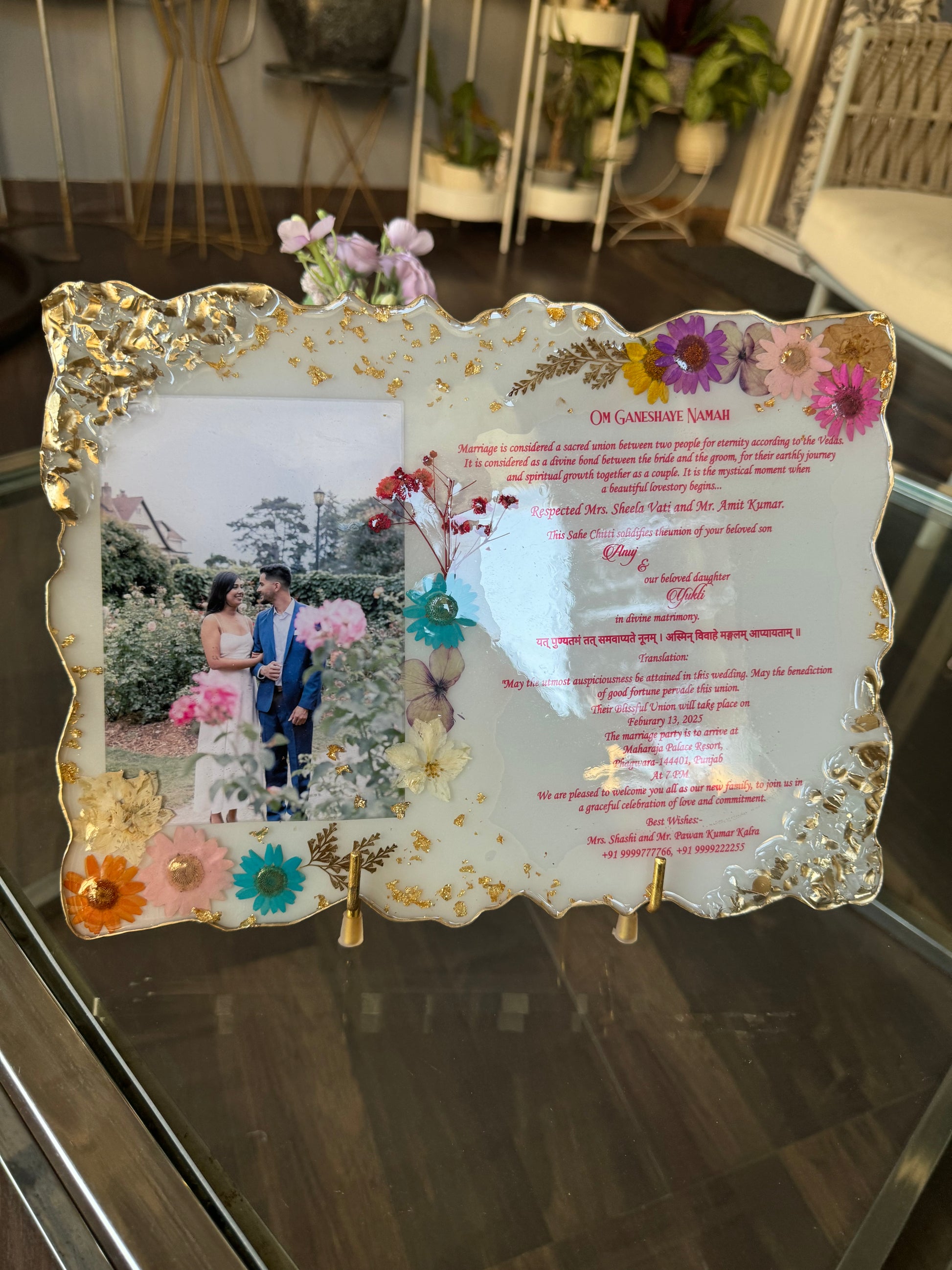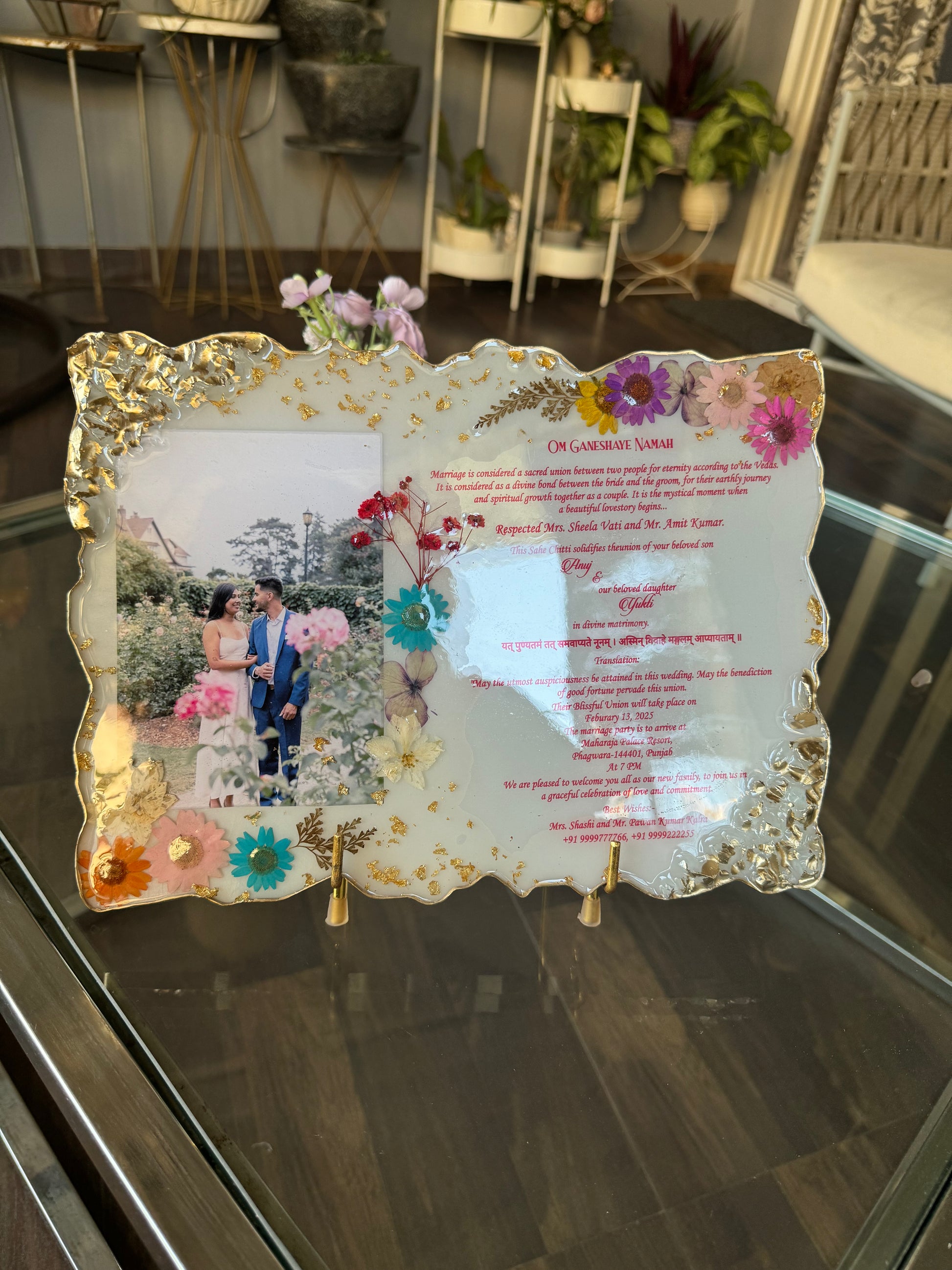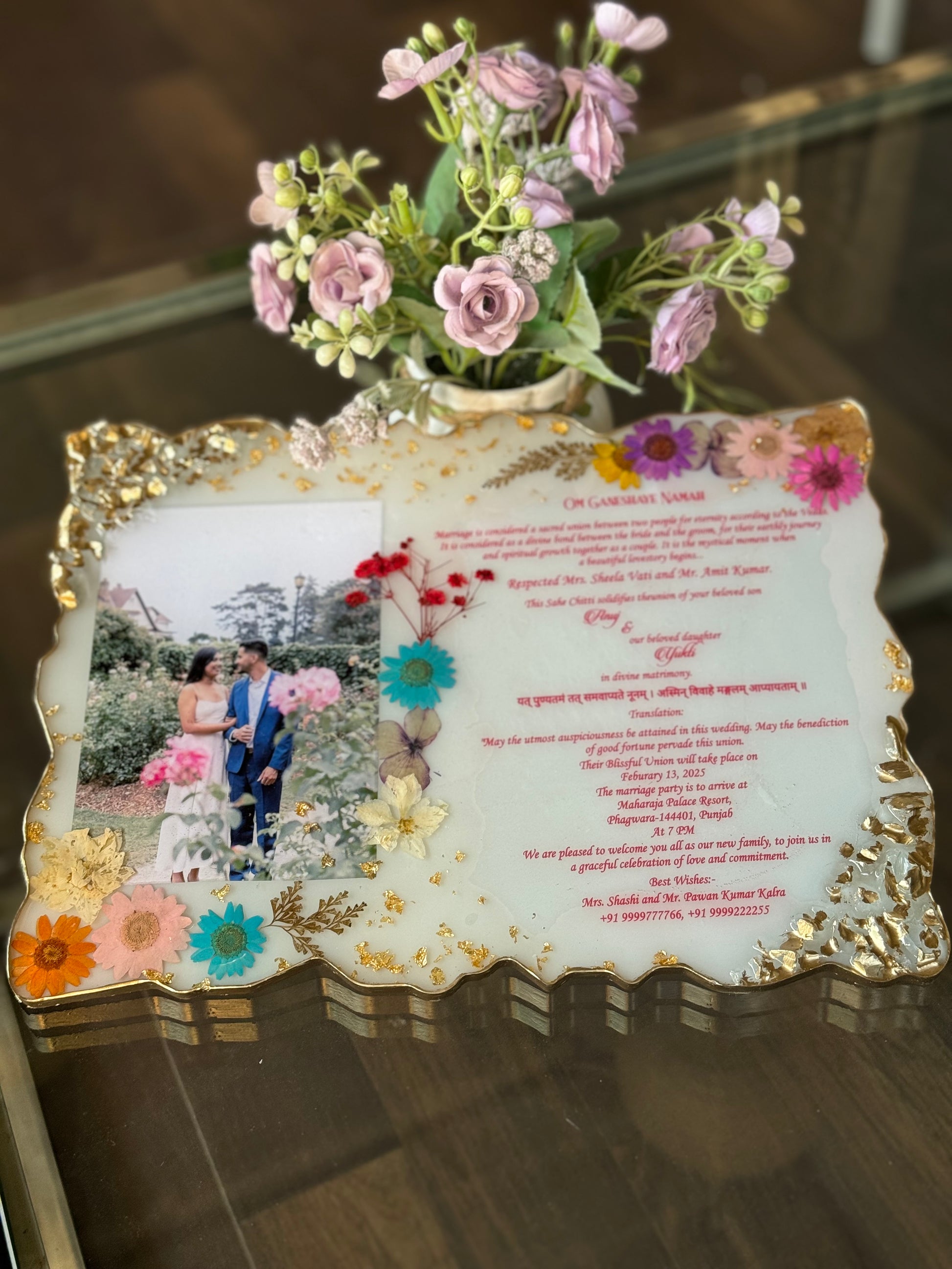 Elevate your special day with our customised wedding invitation card. Made with handmade resin, this exquisite invitation adds a unique touch to your invitations. Each one carefully crafted for a luxurious and tasteful experience. Perfect for the discerning couple ready to make a statement. Handmade wedding invitation card - We memorialise your invitation, save the date, and any other cards in this beautiful resin card.