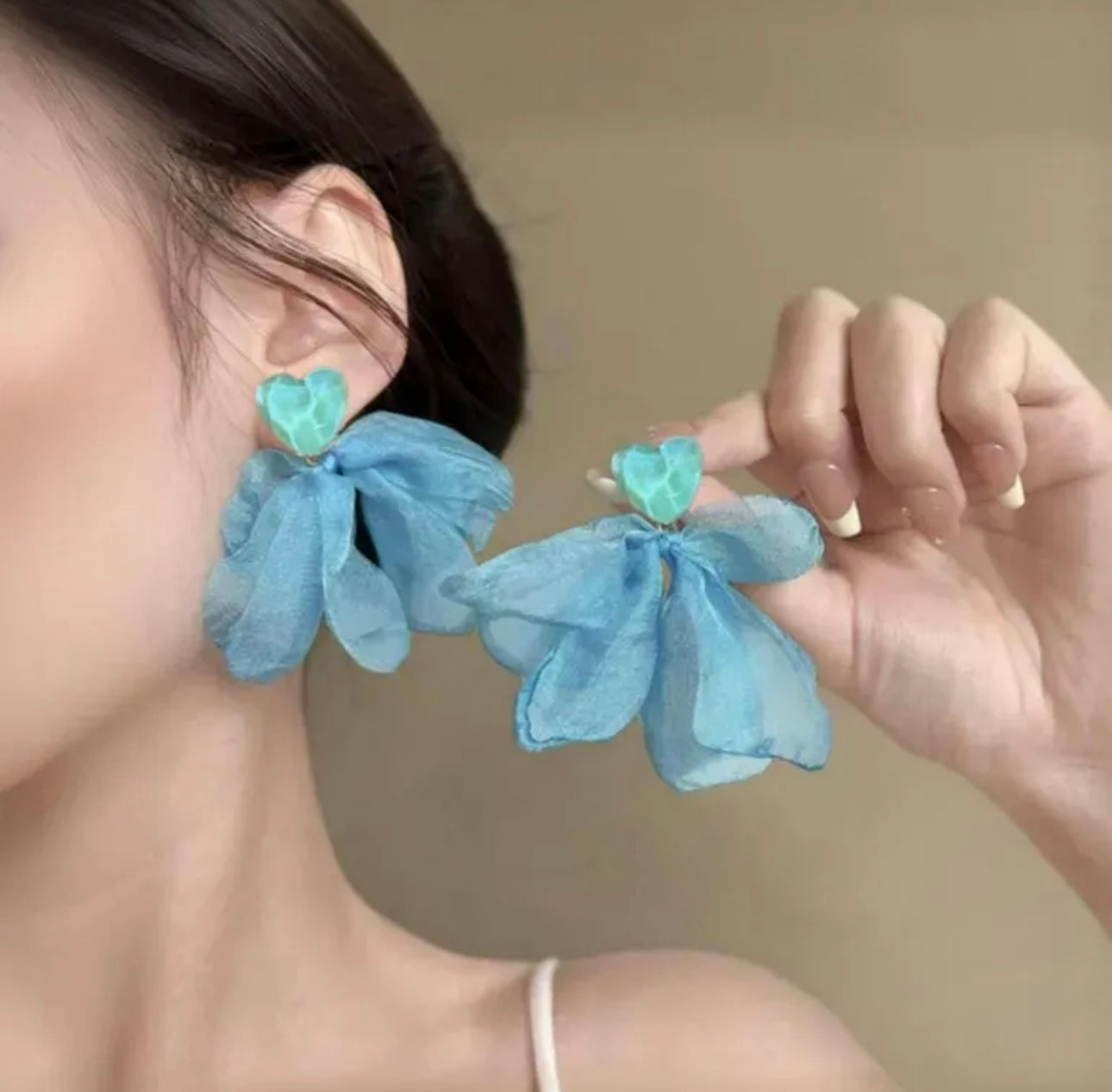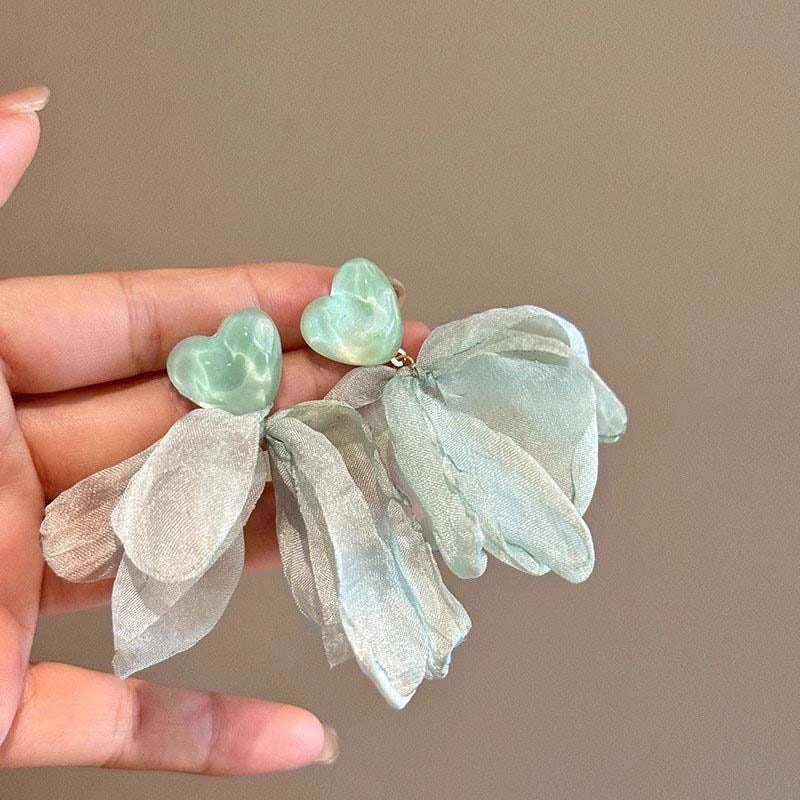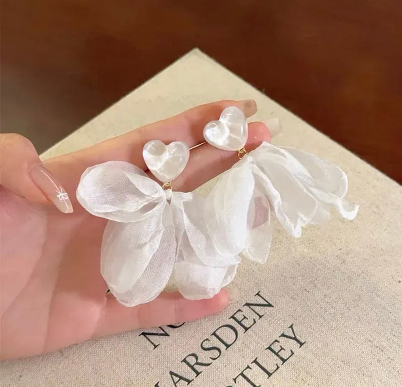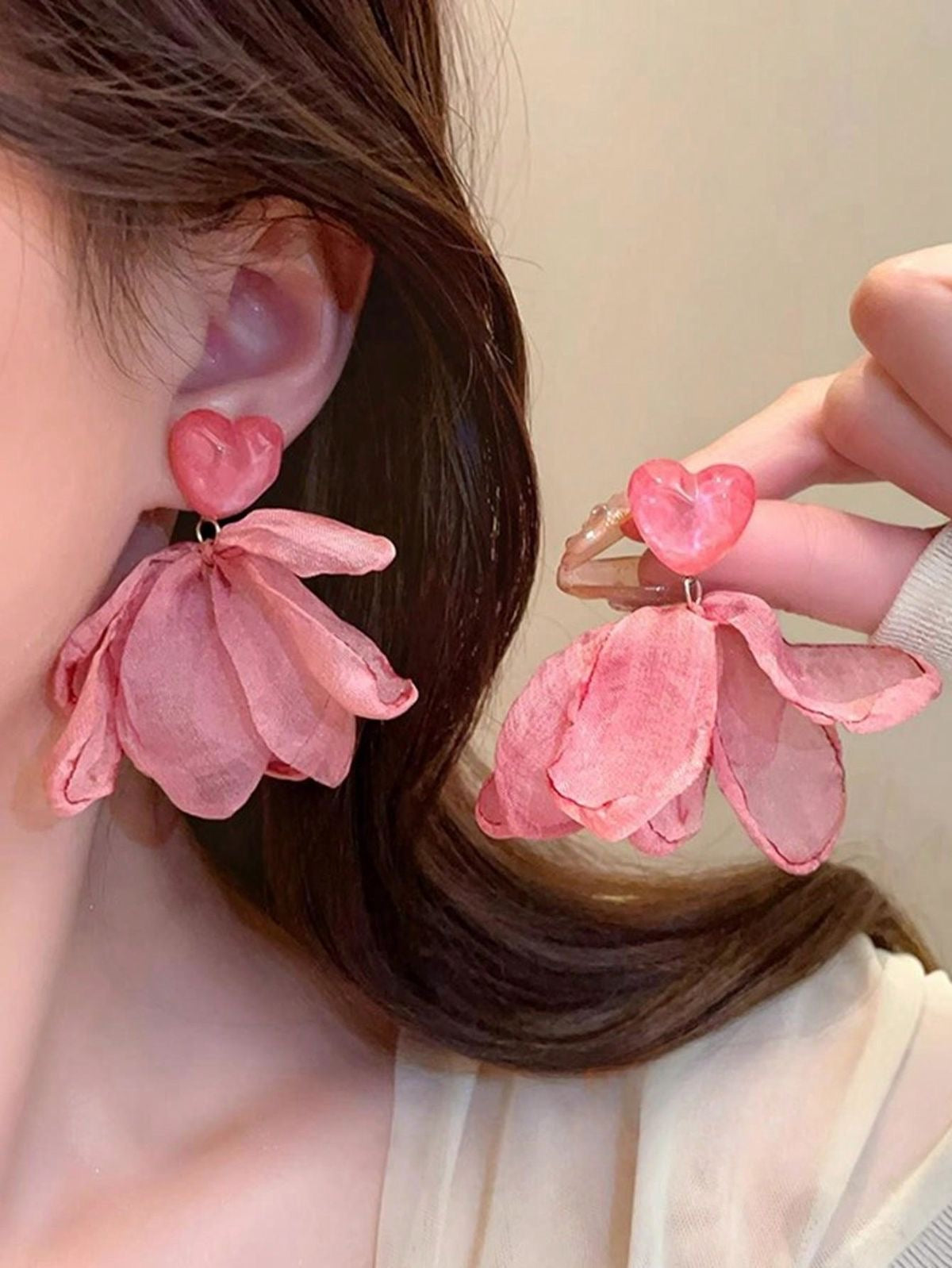 Heart Shape Lace Mesh Flower Chiffon Earrings