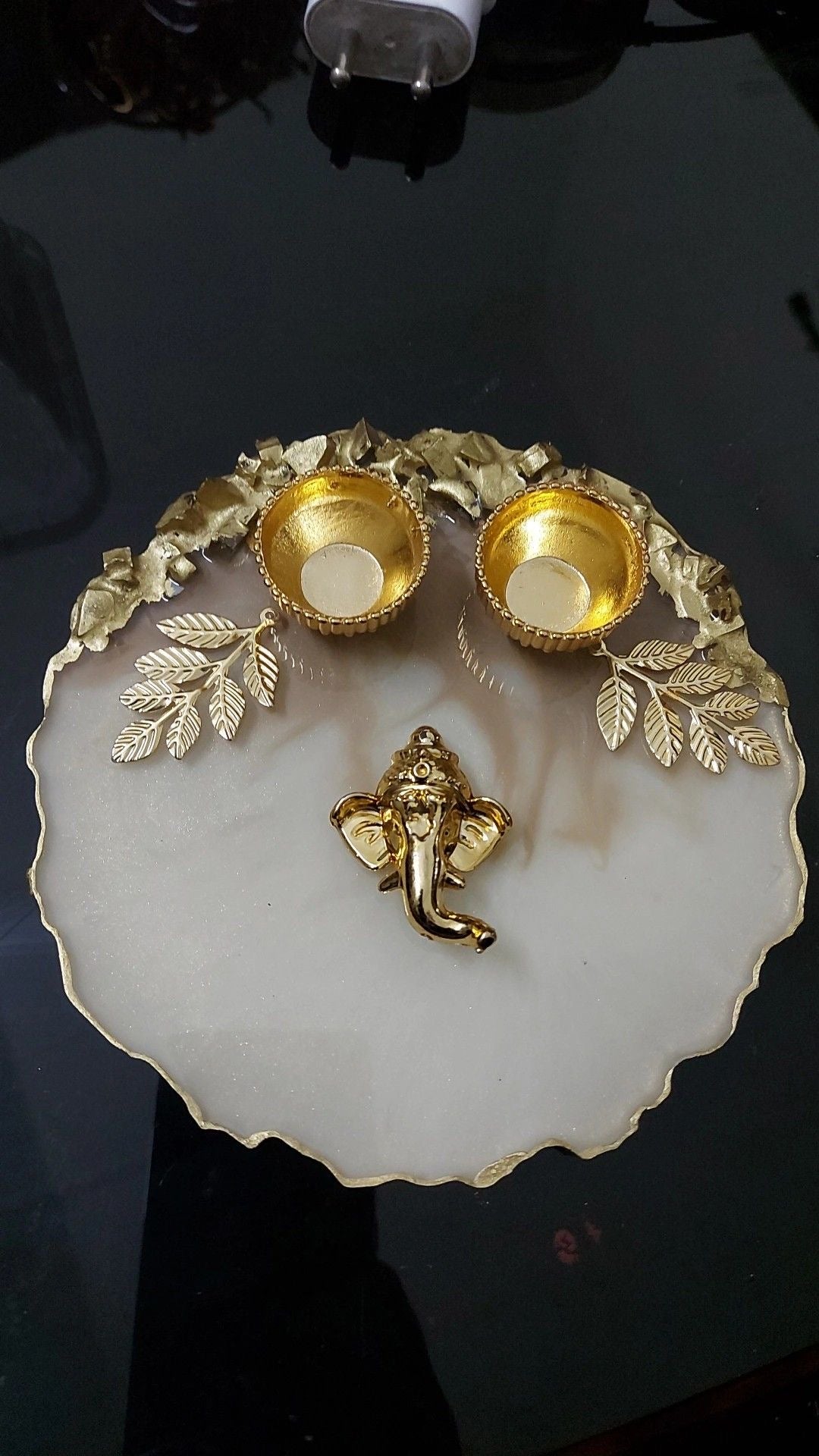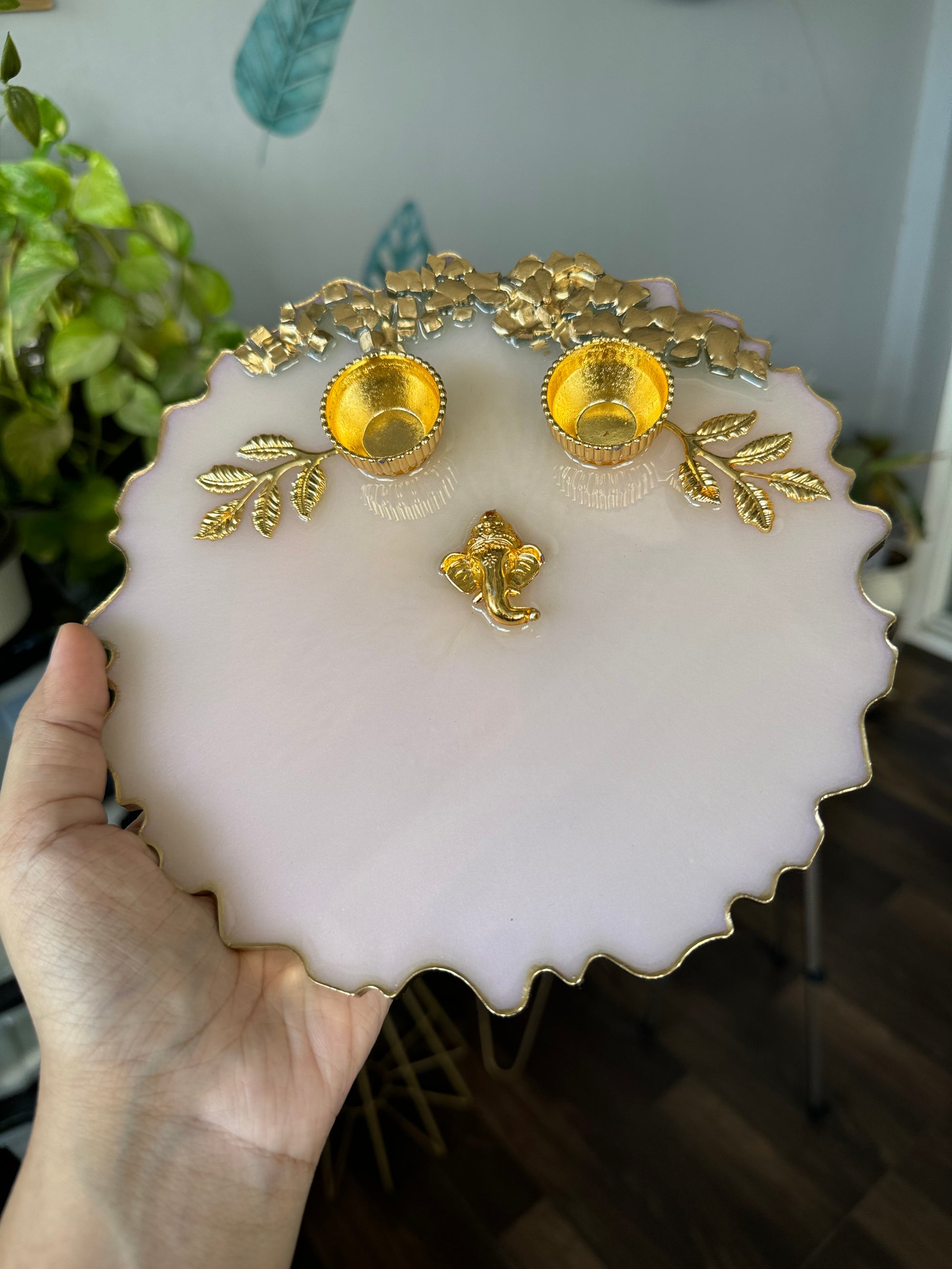 Make the festivals extra special for your loved ones with these beautiful and unique pooja thalis for Diwali / Karwachauth / Rakshabandhan / auspicious occasions. This gorgeous thali is worth looking at, is made of durable and high-quality resin material that is designed to last. Its lovely colors and gold flakes add a burst of enchantment to any occasion. This special thali is an ideal token of your appreciation and love - the perfect way to celebrate this special bond with your loved ones. Beautifully handmade with intricate details, the thali features smooth edges and intricate detailing. Add a touch of elegance to your home decor with this unique thali.