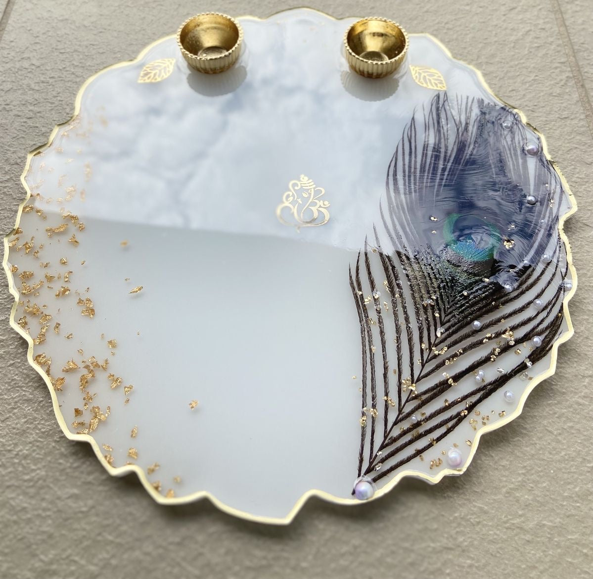 Make the festivals extra special for your loved ones with these beautiful and unique pooja thalis for Diwali / Karwachauth / Rakshabandhan / auspicious occasions. This gorgeous thali is worth looking at, is made of durable and high-quality resin material that is designed to last. Its lovely colors and gold flakes add a burst of enchantment to any occasion. This special thali is an ideal token of your appreciation and love - the perfect way to celebrate this special bond with your loved ones. Beautifully handmade with intricate details, the thali features smooth edges and intricate detailing. Add a touch of elegance to your home decor with this unique thali.