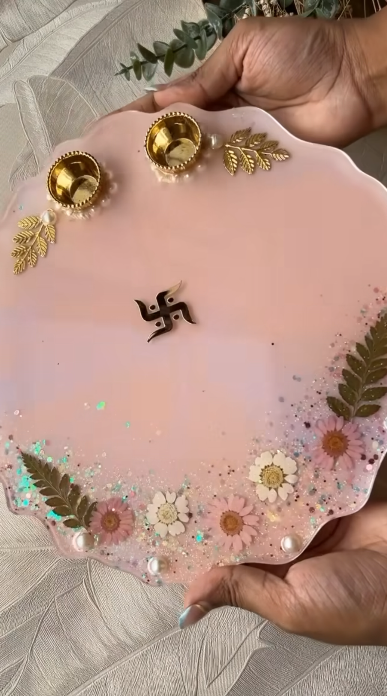 Make the festivals extra special for your loved ones with these beautiful and unique pooja thalis for Diwali / Karwachauth / Rakshabandhan / auspicious occasions. This gorgeous thali is worth looking at, is made of durable and high-quality resin material that is designed to last. Its lovely colors and gold flakes add a burst of enchantment to any occasion. Add a touch of elegance to your home decor with this unique thali. This special thali is an ideal token of your appreciation and love - the perfect way to celebrate this special bond with your loved ones. Beautifully handmade with intricate details, the thali features smooth edges and intricate detailing.