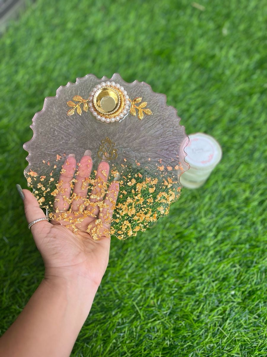 Make the festivals extra special for your loved ones with these beautiful and unique pooja thalis for Diwali / Karwachauth / Rakshabandhan / auspicious occasions. This gorgeous thali is worth looking at, is made of durable and high-quality resin material that is designed to last. Its lovely colors and gold flakes add a burst of enchantment to any occasion. This special thali is an ideal token of your appreciation and love - the perfect way to celebrate this special bond with your loved ones. Beautifully handmade with intricate details, the thali features smooth edges and intricate detailing. Add a touch of elegance to your home decor with this unique thali.