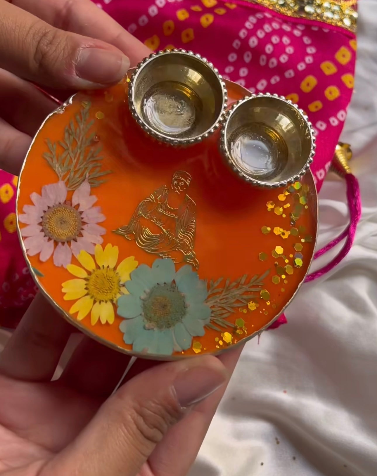 Make the festivals extra special for your loved ones with these beautiful and unique pooja thalis for Diwali / Karwachauth / Rakshabandhan / auspicious occasions. This gorgeous thali is worth looking at, is made of durable and high-quality resin material that is designed to last. Its lovely colors and gold flakes add a burst of enchantment to any occasion. This special thali is an ideal token of your appreciation and love - the perfect way to celebrate this special bond with your loved ones. Beautifully handmade with intricate details, the thali features smooth edges and intricate detailing. Add a touch of elegance to your home decor with this unique thali.