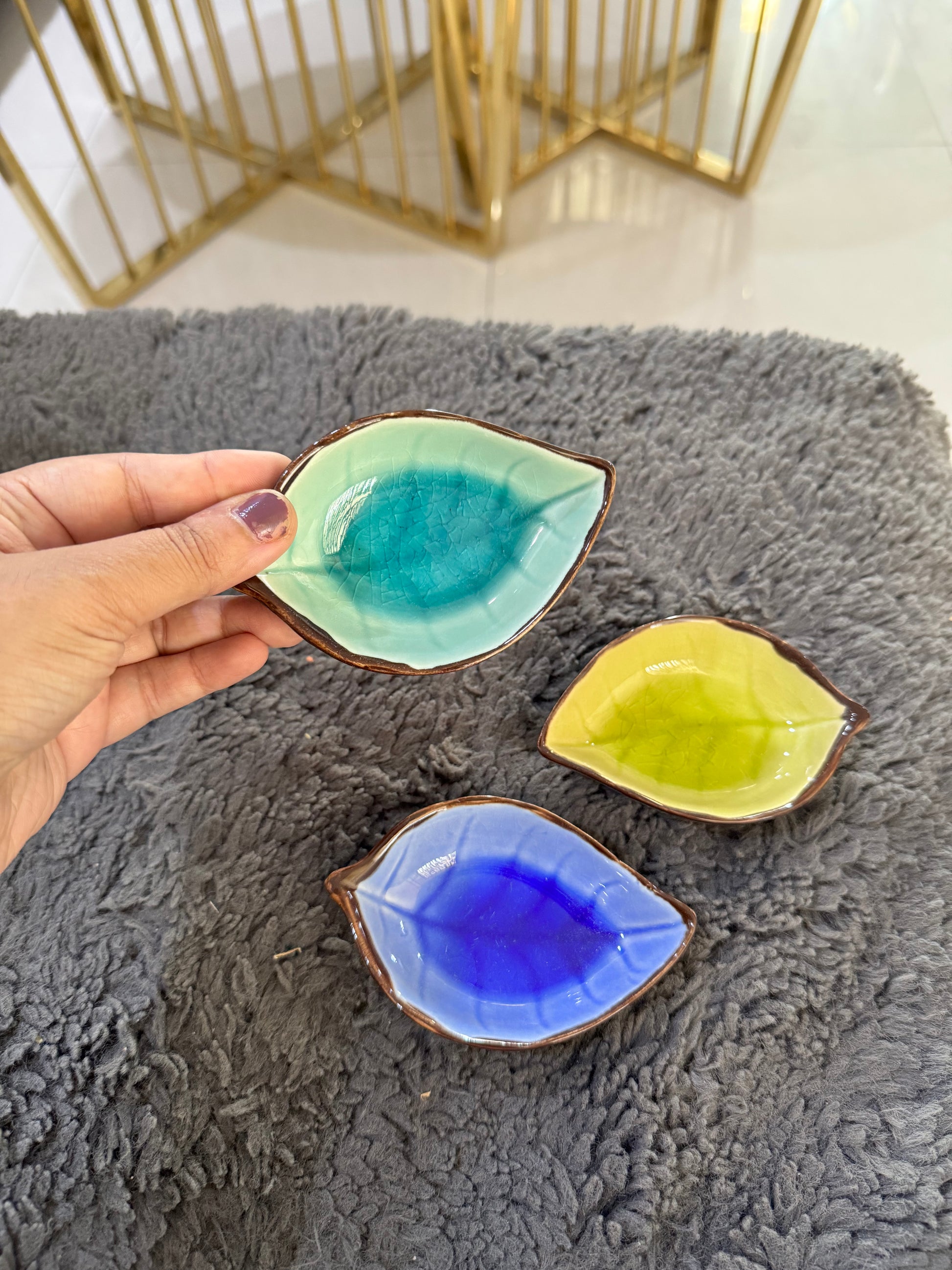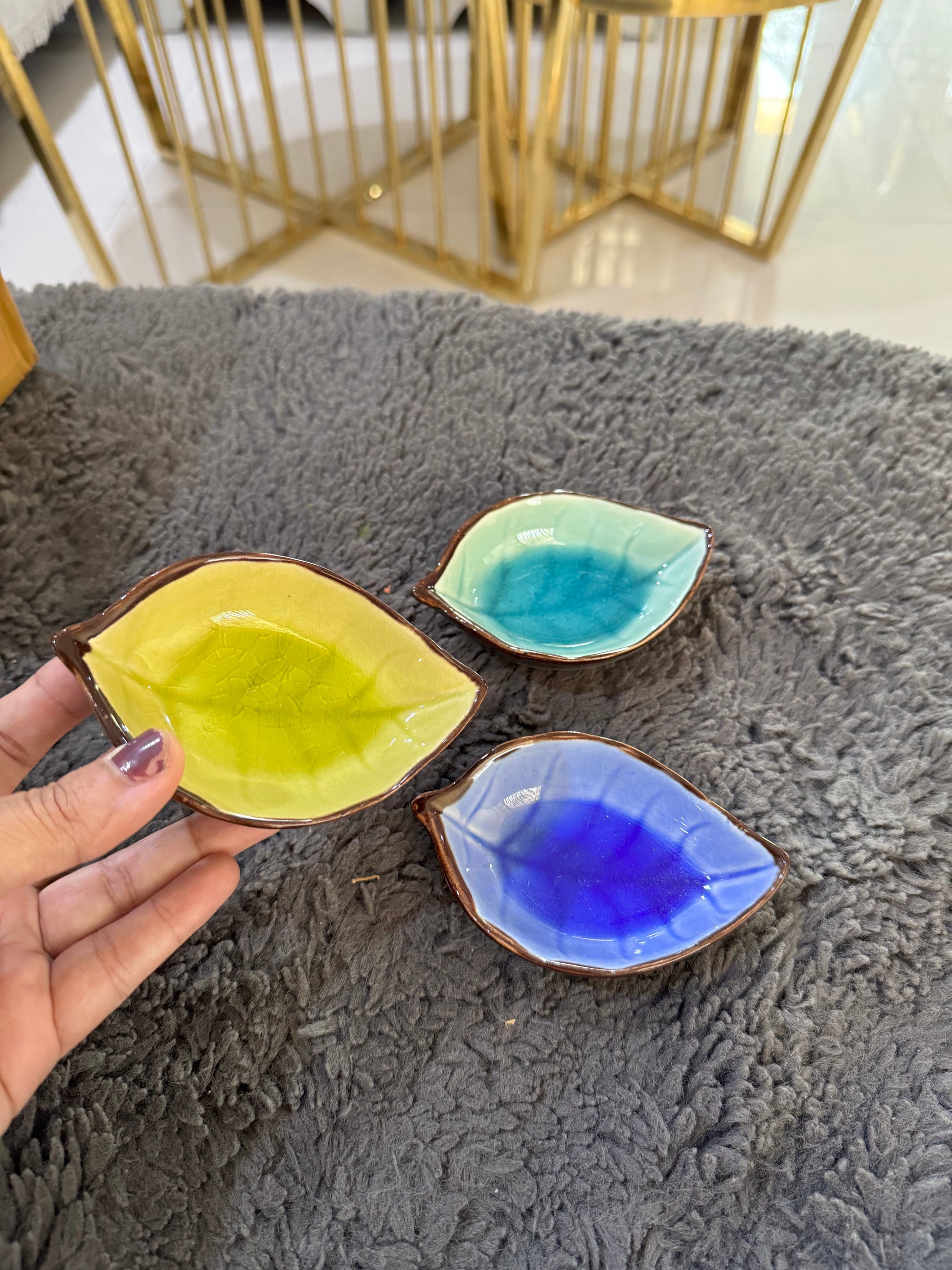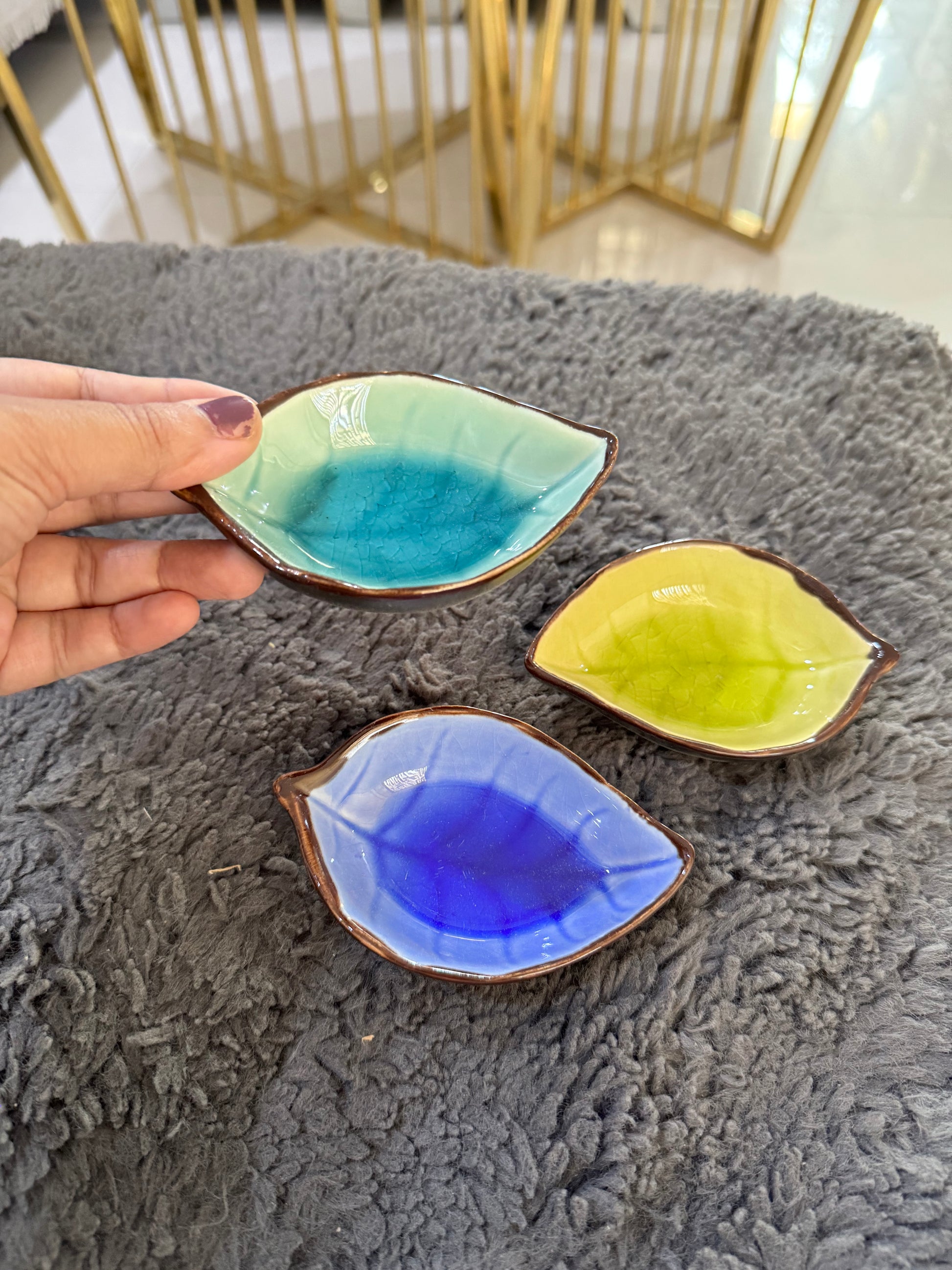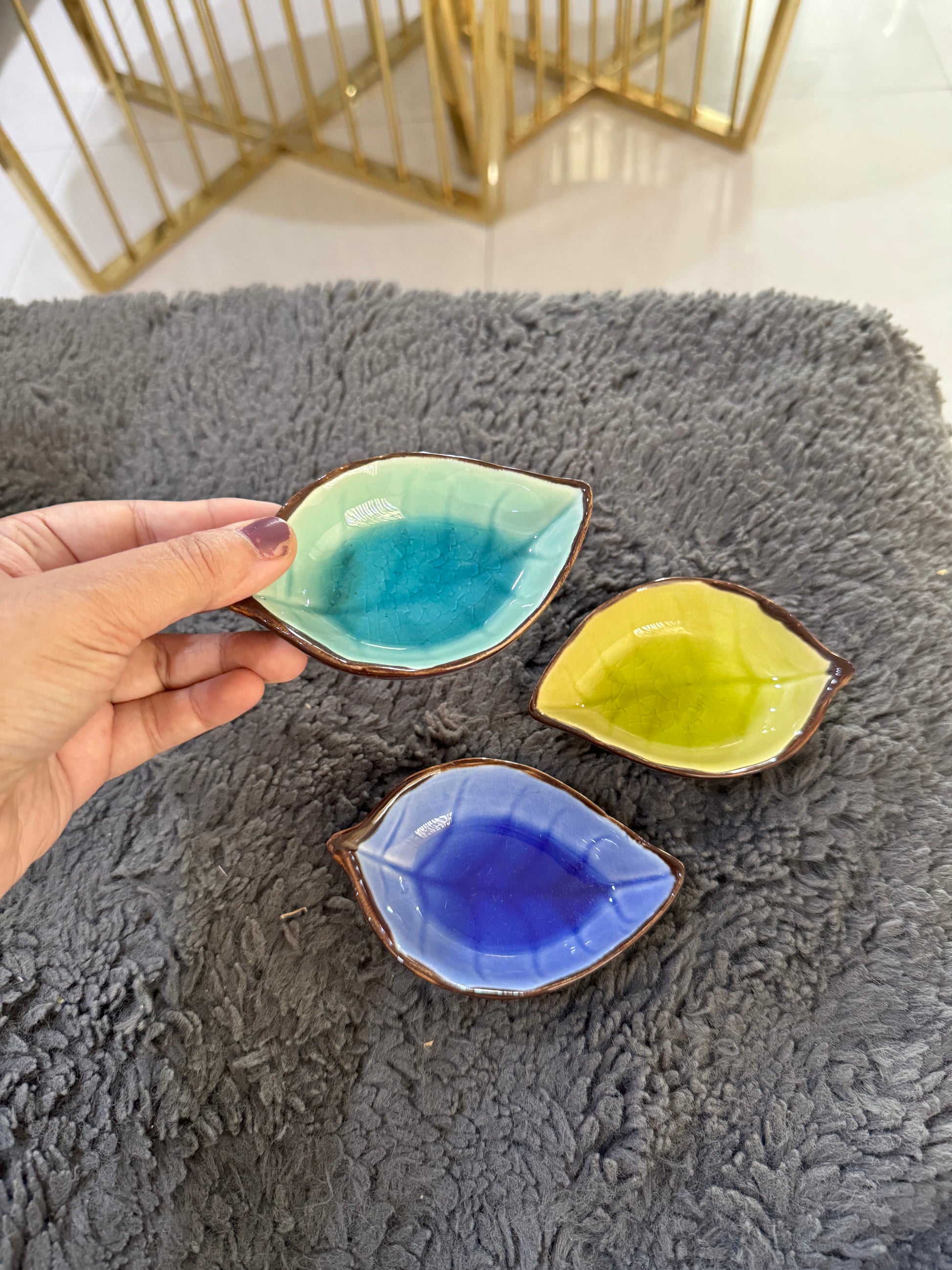Elevate your dining experience with our Ceramic Leaf Shaped Small Dip/Chutney Bowls - Set of 3 These unique and vibrant bowls add a touch of art to your table while providing a convenient way to serve dips and chutneys. Handcrafted with care, each bowl is a statement piece that adds character to any meal.