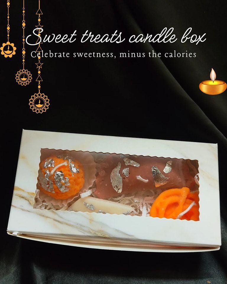 Celebrate Diwali with the perfect blend of tradition and charm. Our Indian Sweets/Mithai Candles Combo Box lets you create a personalized sweets and candle set, bringing warmth and sweetness to your festivities. Handpick your favorite mithai-inspired candles paired with authentic Indian sweets for a thoughtful gift or festive decor. This combo box adds a unique, fragrant glow to your celebrations while delighting taste buds, making your Diwali truly unforgettable. Indulge in the festive spirit with our Sweets Candles. These unique candles are perfect for Diwali gifting, whether it's for a corporate event or a personal celebration. Light up someone's day with these delightful and fragrant candles, adding a touch of sweetness to their Diwali festivities! Hand-crafted with essential oils and soy wax, these candles will infuse your home with a delicate and uplifting floral scent. These unique candles feature festive and whimsical Indian sweets design, adding a touch of fun and cheer to diwali celebrations.