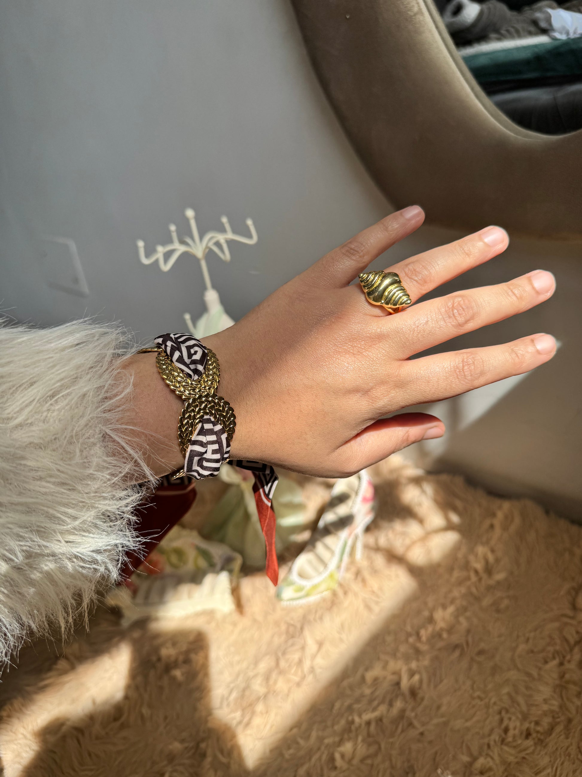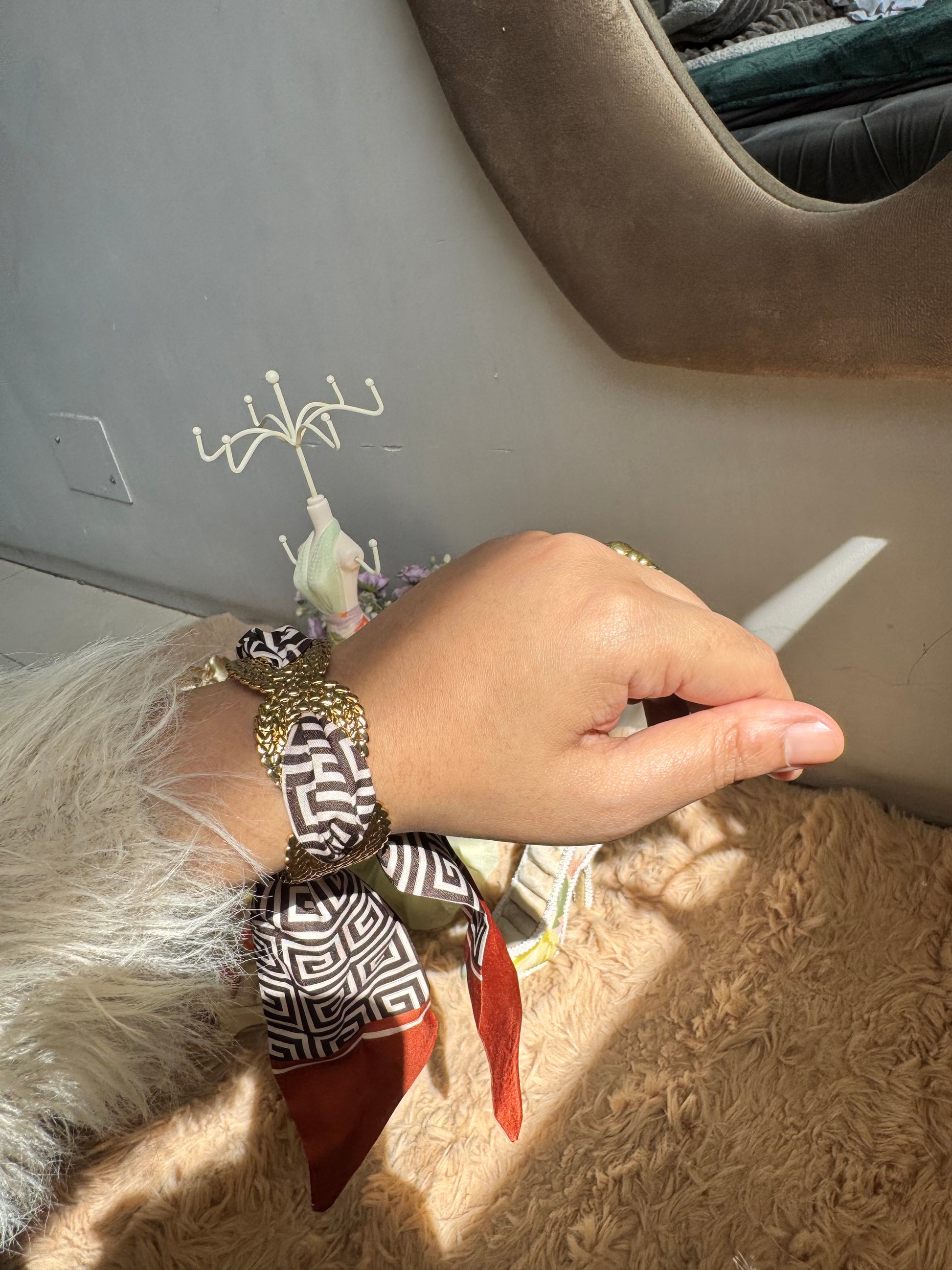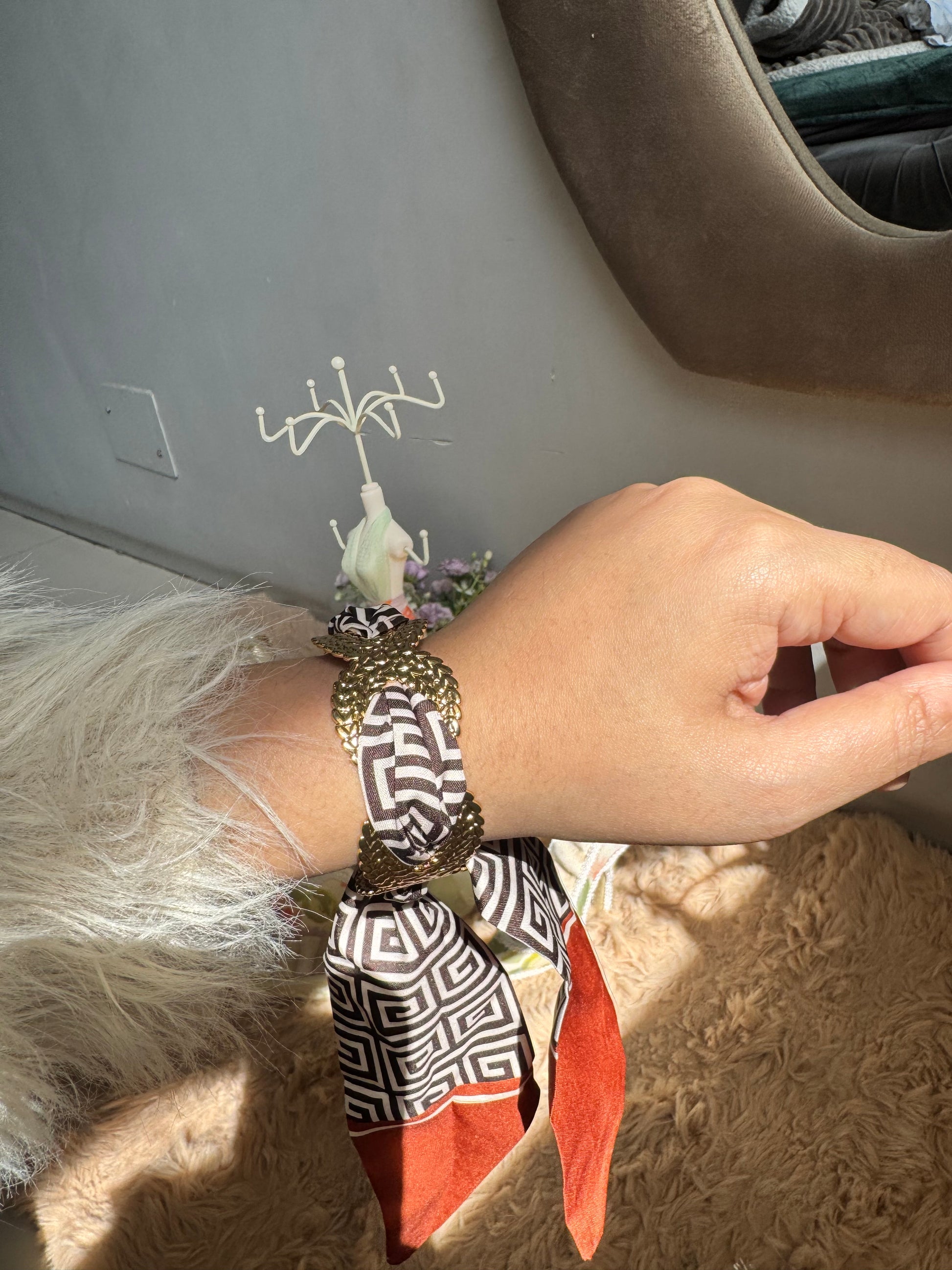 Premium Metal Cuff Statement Adjustable Bracelet with Satin Scarf