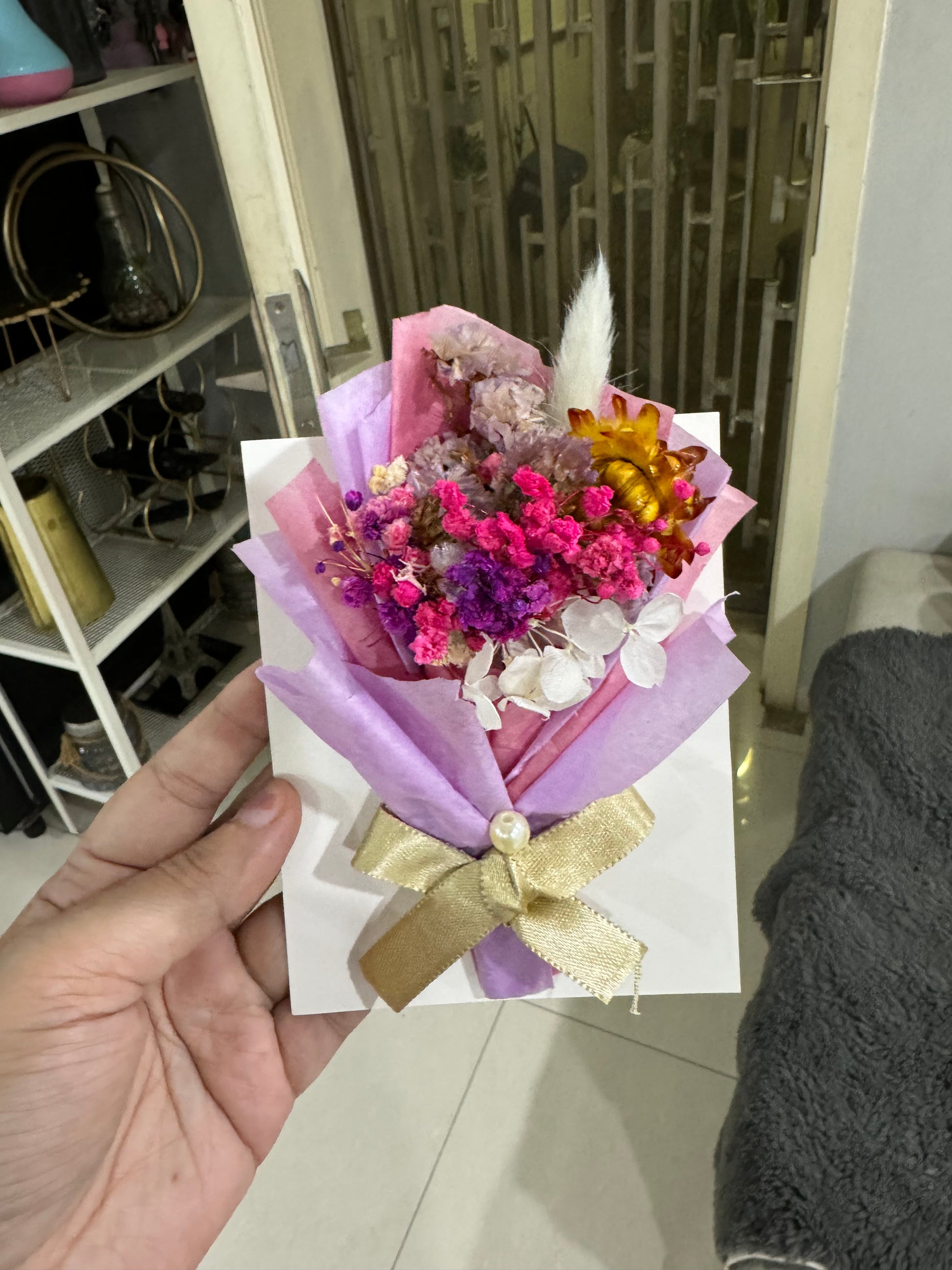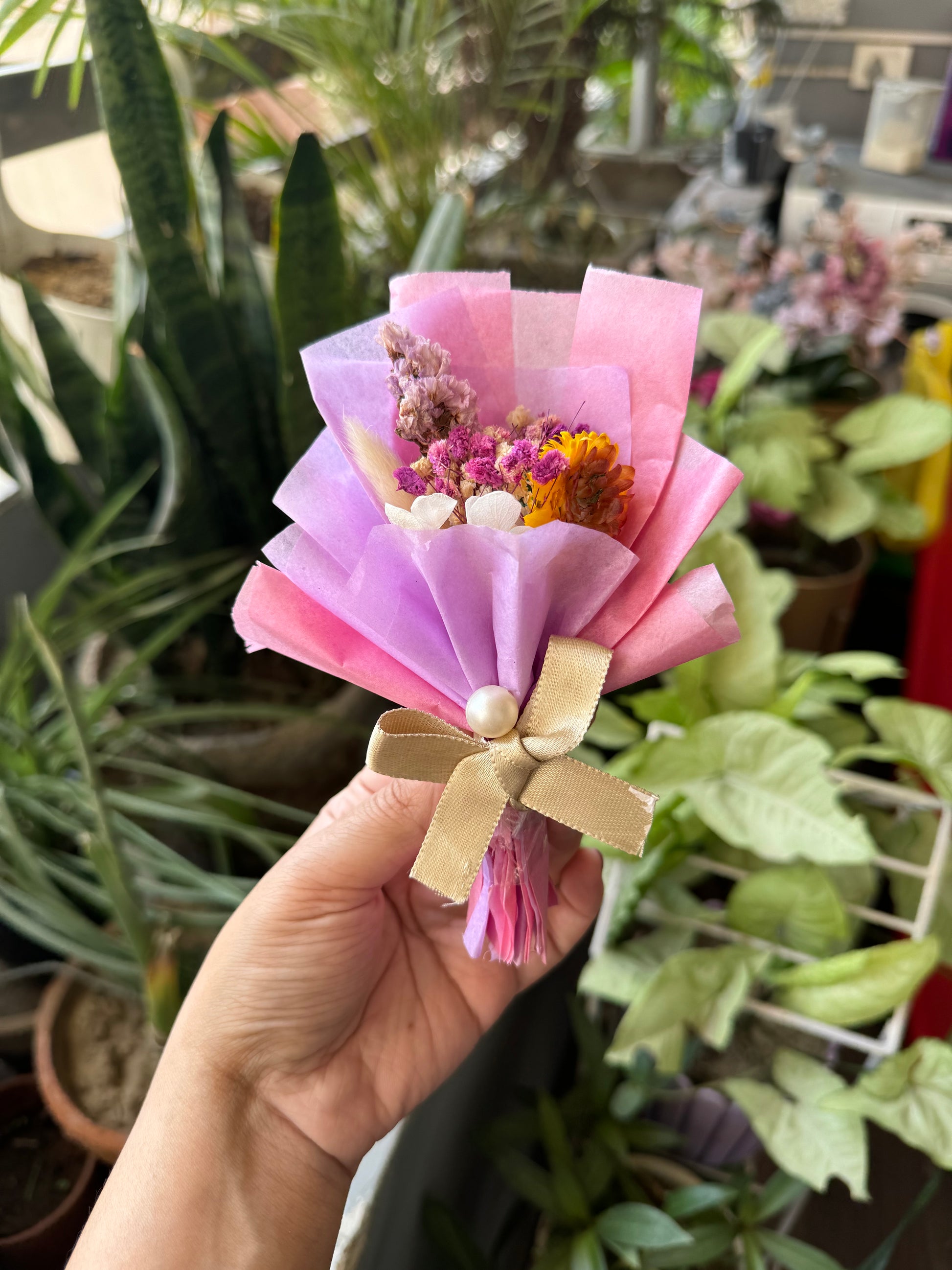 Introducing our Aesthetic Dried Flower Small Bouquet, a delightful fusion of nature's beauty and timeless elegance. Handcrafted with care and attention to detail, each bouquet is a miniature masterpiece, perfect for adding a touch of charm to any space. These petite arrangements feature an exquisite selection of dried flowers meticulously arranged to create a harmonious blend of colors, textures, and shapes. From delicate baby's breath to vibrant dried roses, every element is chosen for its enduring beauty and lasting appeal.