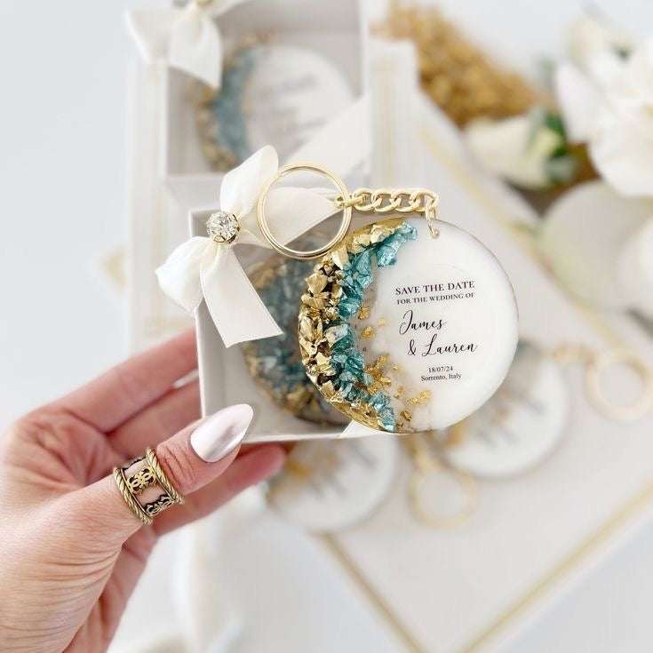 Our personalized keychains are a unique and thoughtful way to show someone you care. Each keychain is handmade with high-quality epoxy resin and can be customized with a variety of different inclusions, such as names, initials, dates.