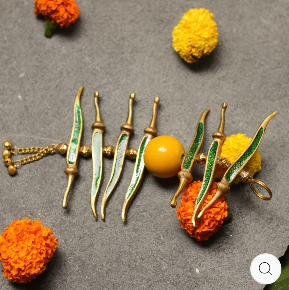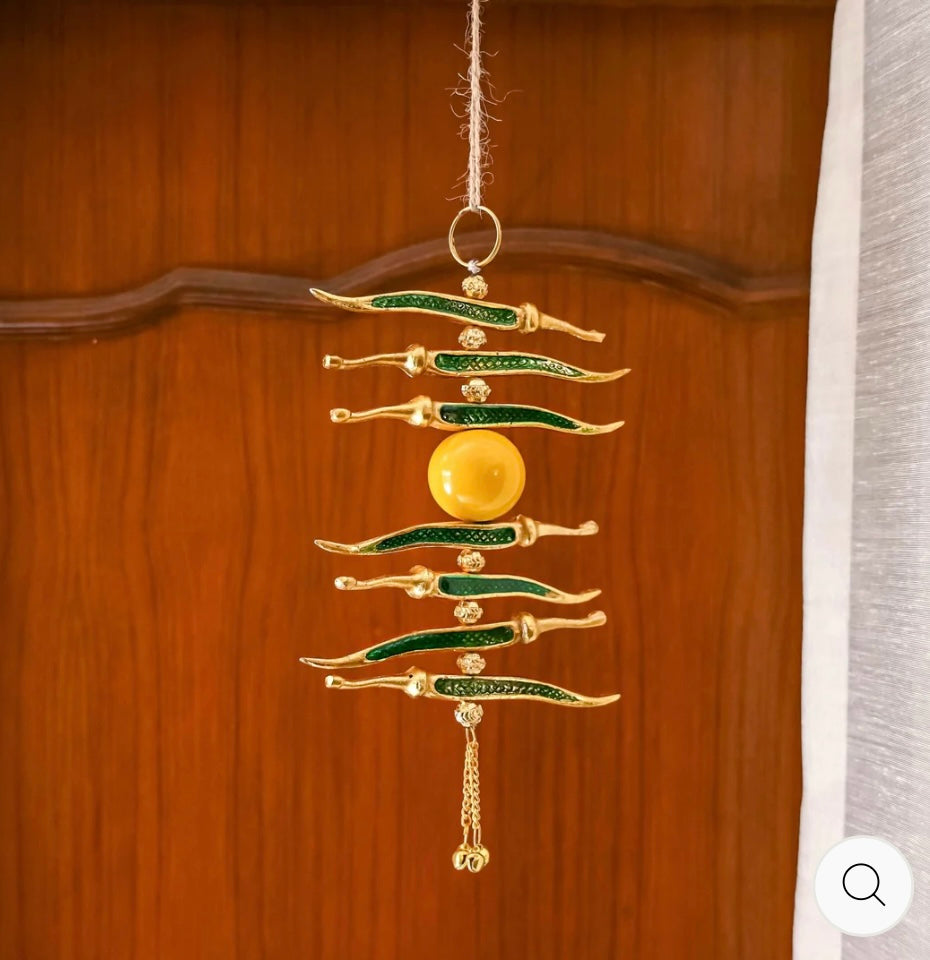 Protect your space from negative energy with our Exclusive Nimbu Mirchi Metal Hanging! Hang it on your door, car, or in your home to ward off the evil eye and bring positivity. Made of durable metal, it's a stylish and effective nazar battu for your space. Order now and experience its powerful energy!