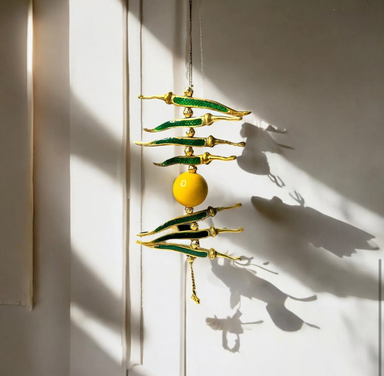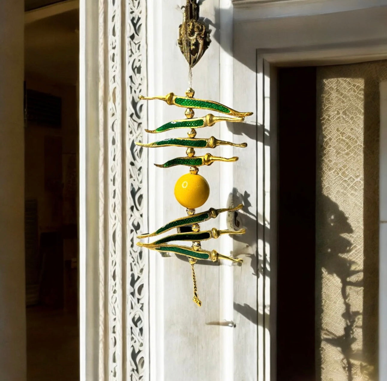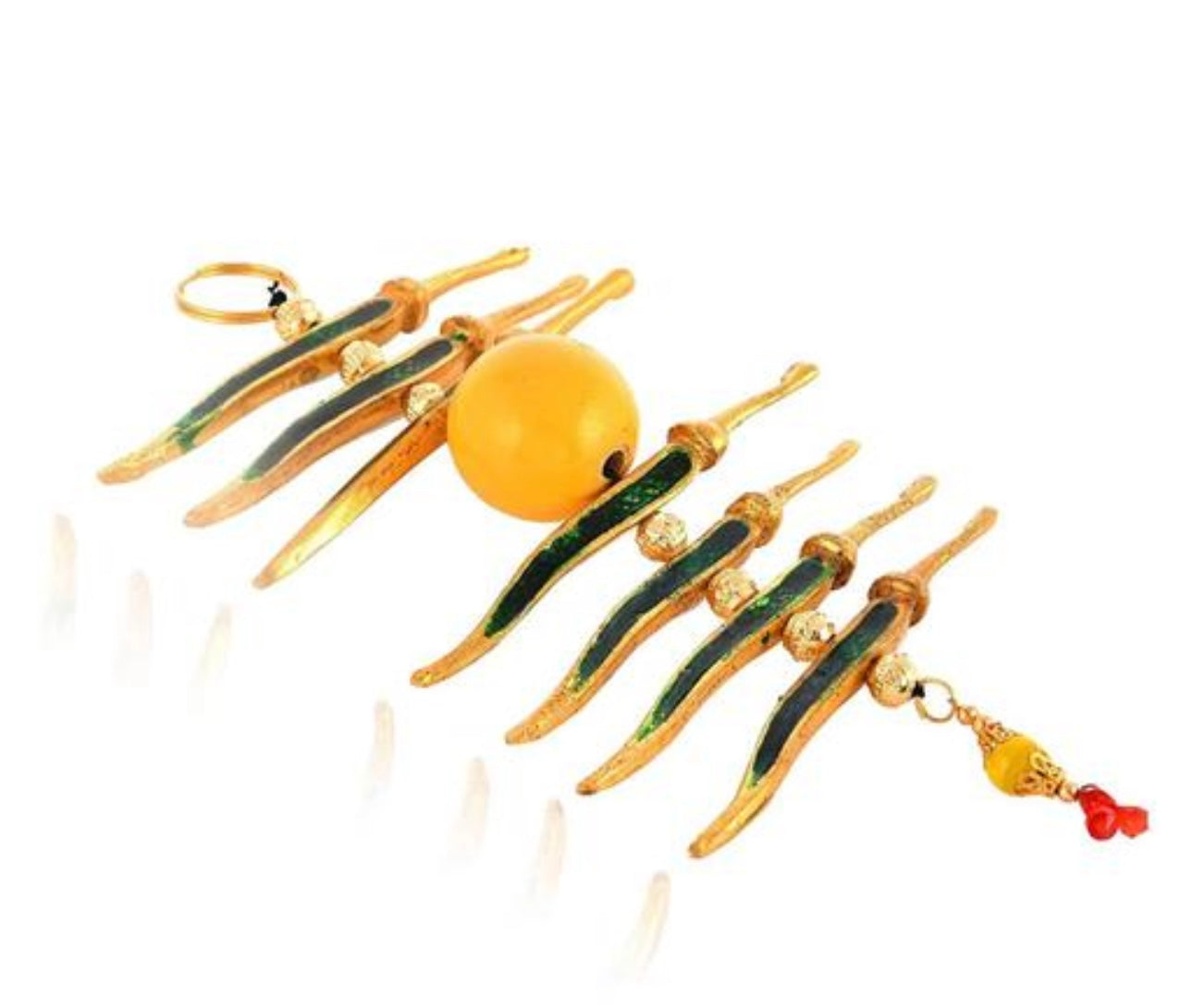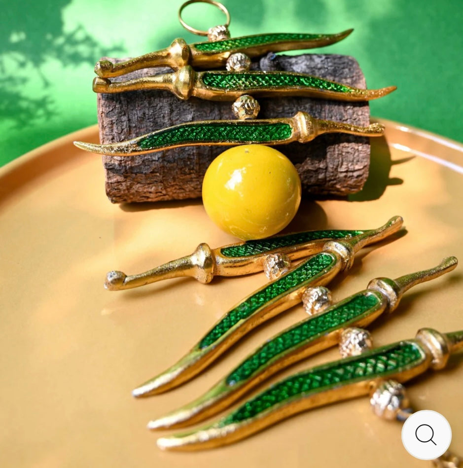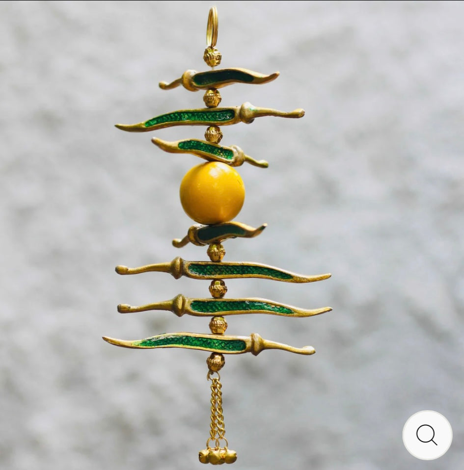 Add some charm to your door, car, or home with our exclusive Nimbu Mirchi metal hanging. The vibrant colors and intricate design will catch everyone's eye and bring good luck to your space. A must-have for anyone who believes in the power of traditional Indian talismans!
