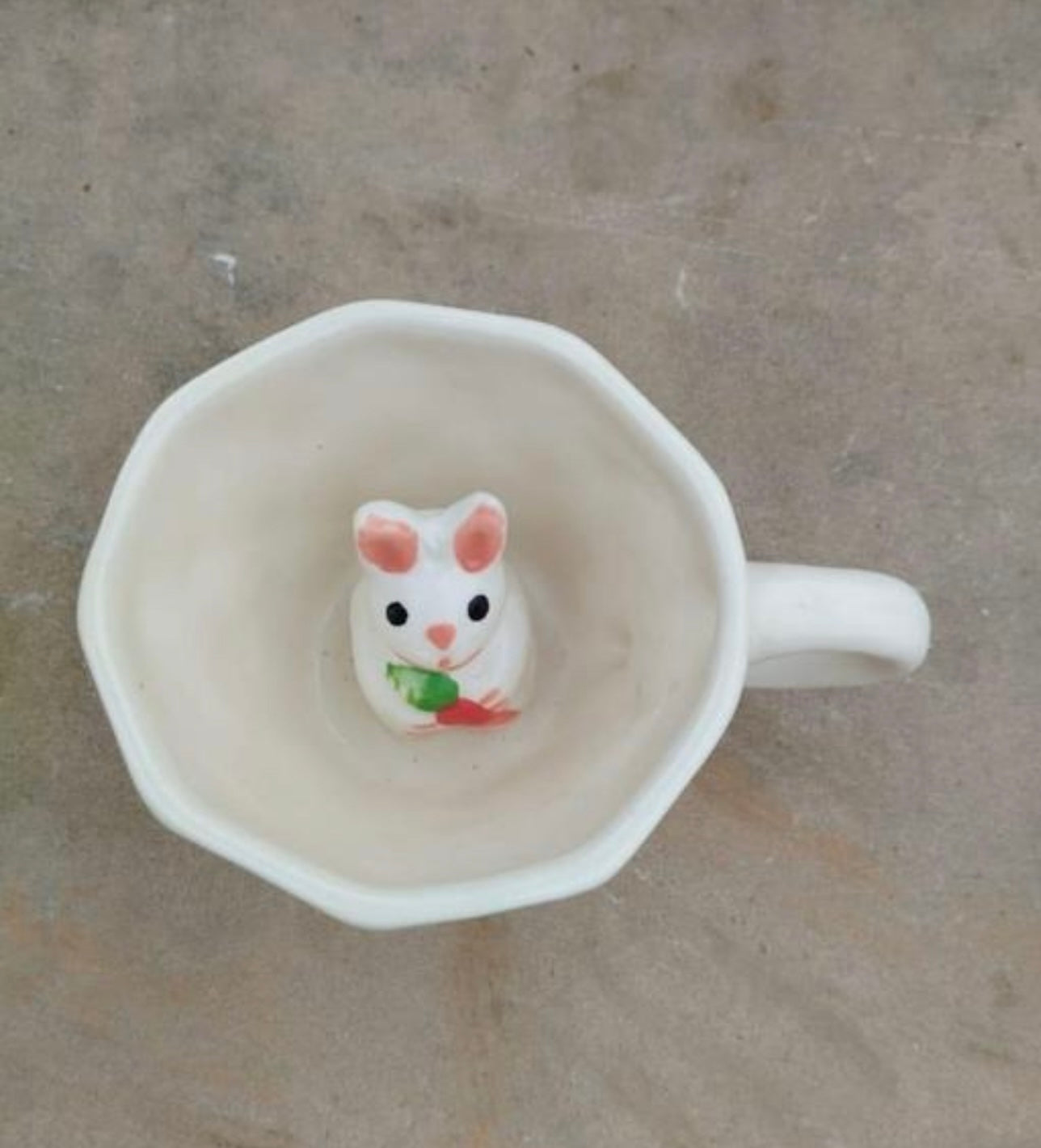 This playful mug with a surprise rabbit inside will make your morning coffee extra special. Pin your favorite ideas while sipping from this quirky animal mug. Perfect for animal lovers who like a touch of whimsy with their caffeine fix! Its cute design offers a comfortable grip while sipping your favorite beverage. Crafted with delicate details, this mug is designed to elevate your tea or coffee experience.