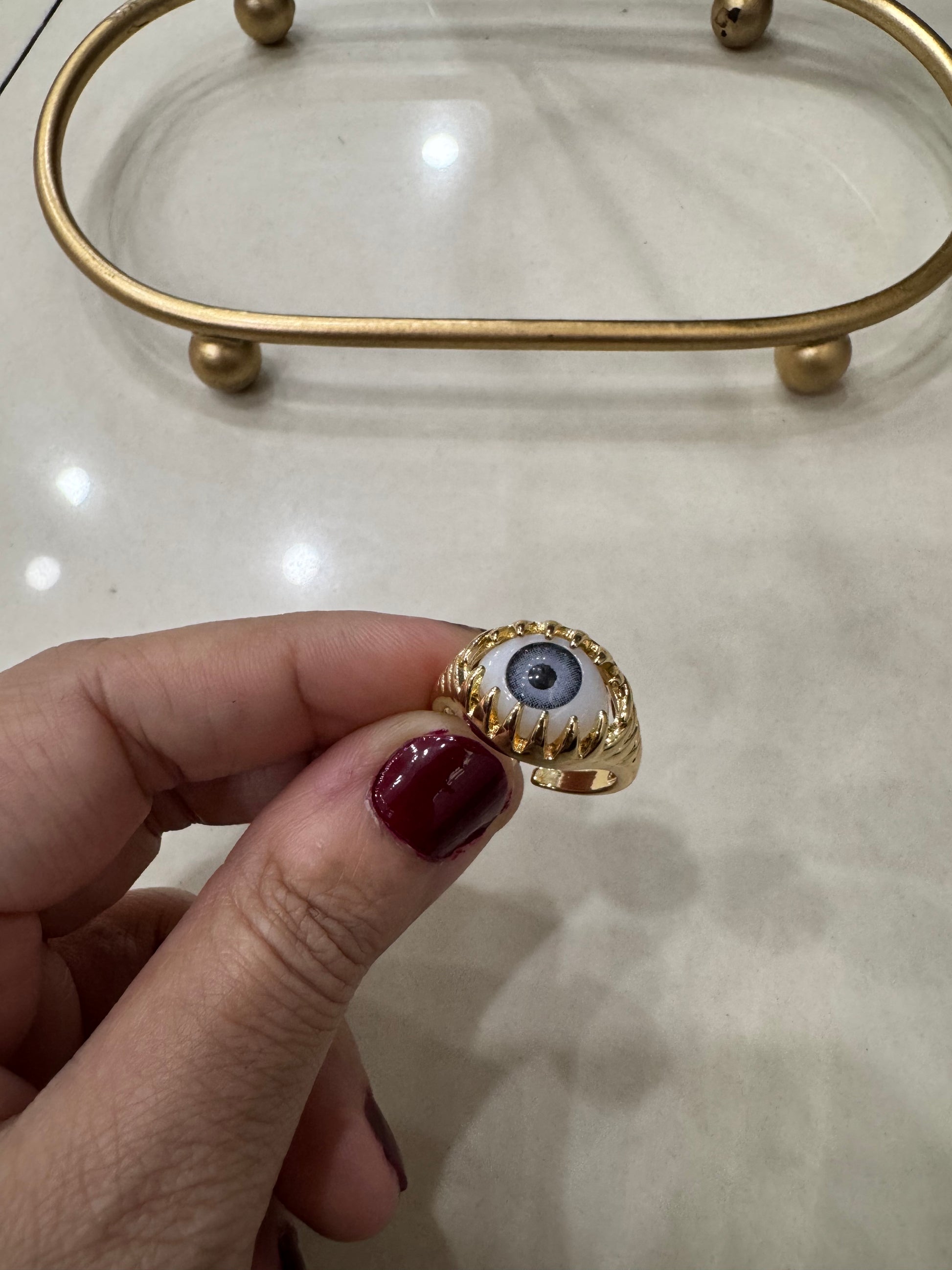 Elevate your style with our Gold Plated Evil Eye Ring. Crafted with exquisite detail and a luxurious design, this ring effortlessly adds a touch of elegance to any outfit. The unique shape is a subtle statement of sophistication, making it the perfect addition to your jewelry collection. Crafted with high-quality gold plated metal, it's a timeless piece that will add a personal touch to any outfit."