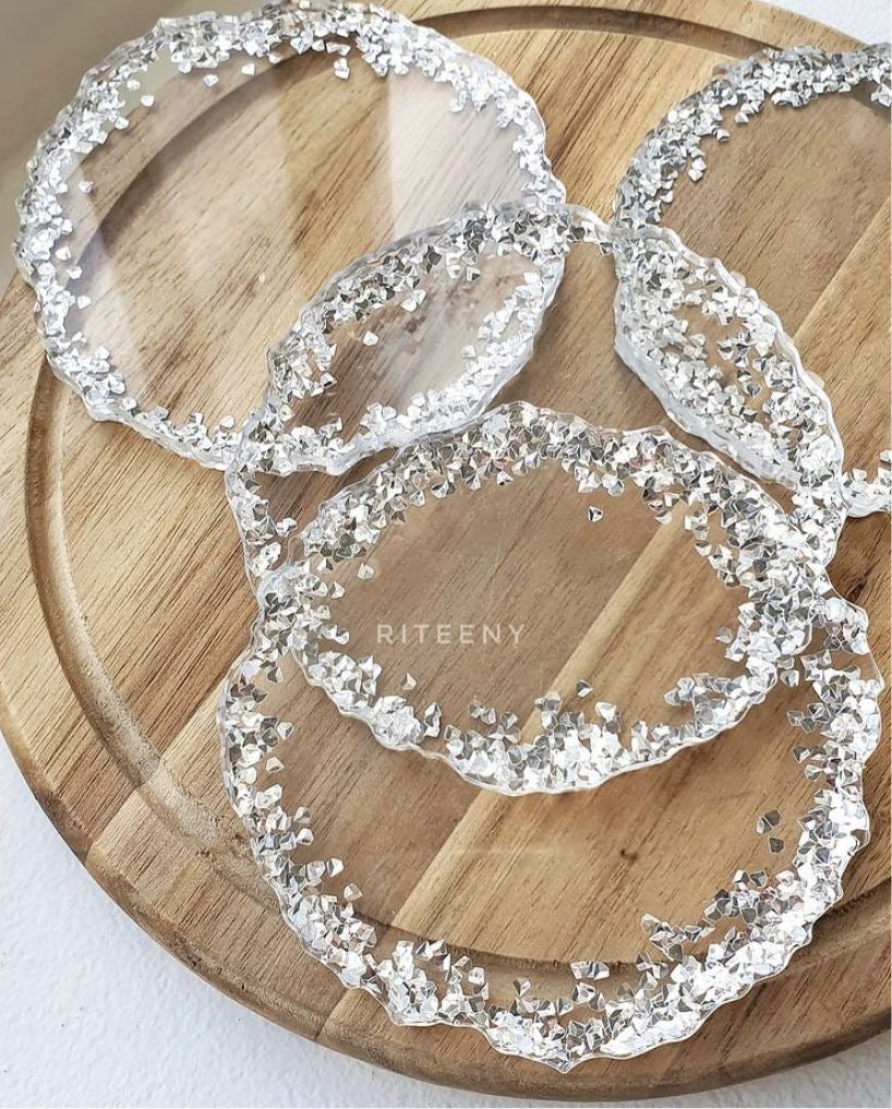 Introducing Luxe Transparent Glittery Coasters - the perfect addition to your home decor! These coasters are not only stylish with their transparent and glittery design, but also functional in protecting your surfaces from spills and stains. Elevate your space and add a touch of luxury with these coasters.Β Beautiful handmade personalized coasters, perfect for housewarming gifts, personal gifts, bridesmaid gifts or for those just wanting extra decor in their home.