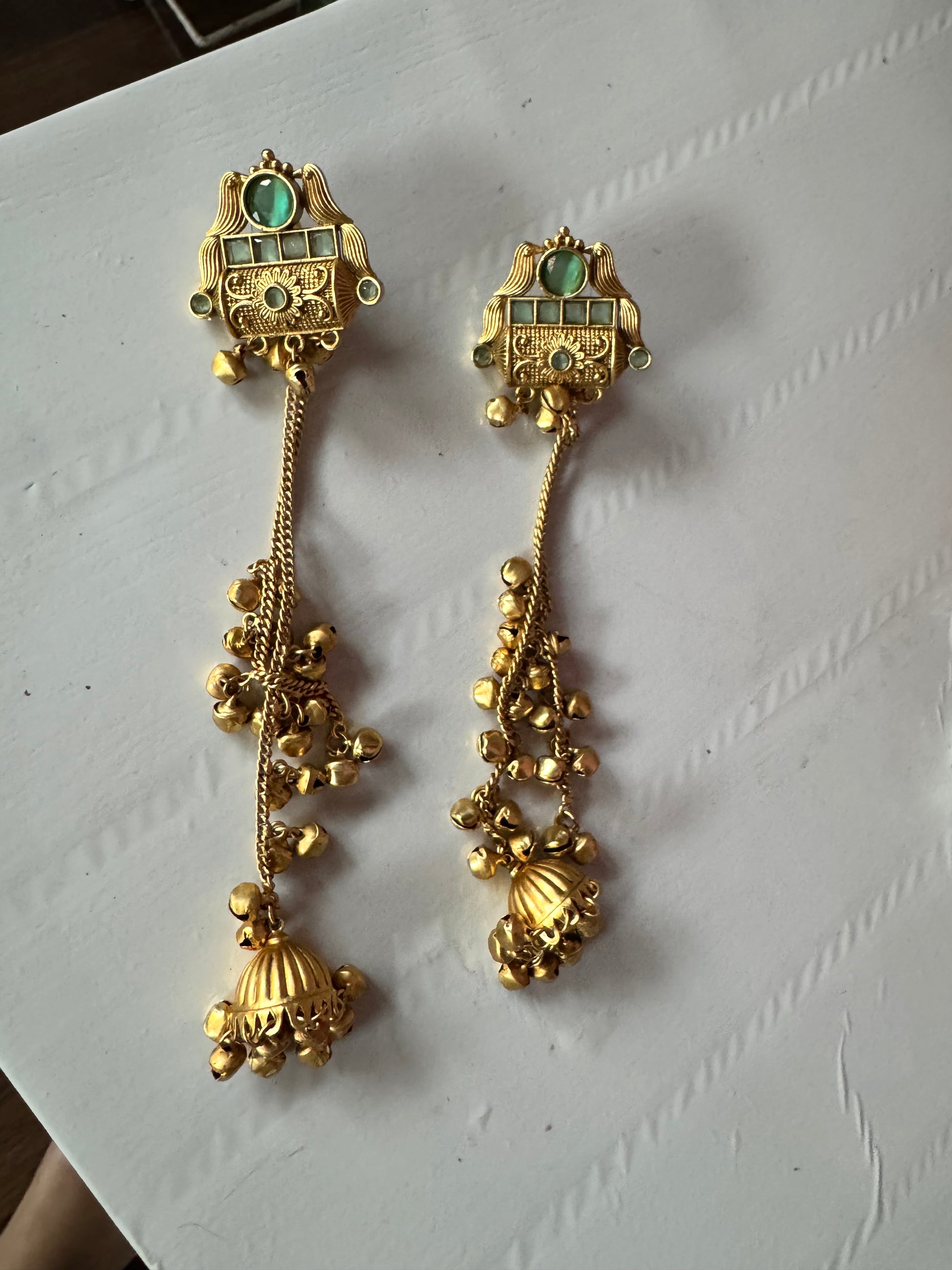 Elevate your style with our Trending Kashmiri Earrings. Delicately crafted with exquisite attention to detail, these earrings add a touch of elegance and sophistication to any outfit. The shell white color and intricate ghungroo design make them a statement piece, perfect for any occasion. The large size adds a touch of drama while the drop design adds movement. Perfect for the free-spirited and fashion-forward individual. Upgrade your accessory game with these exclusive earrings. Perfect for any occasion, these earrings are a must-have for any fashion-forward individual.