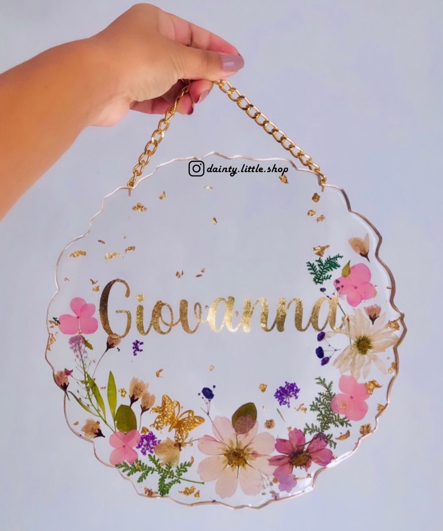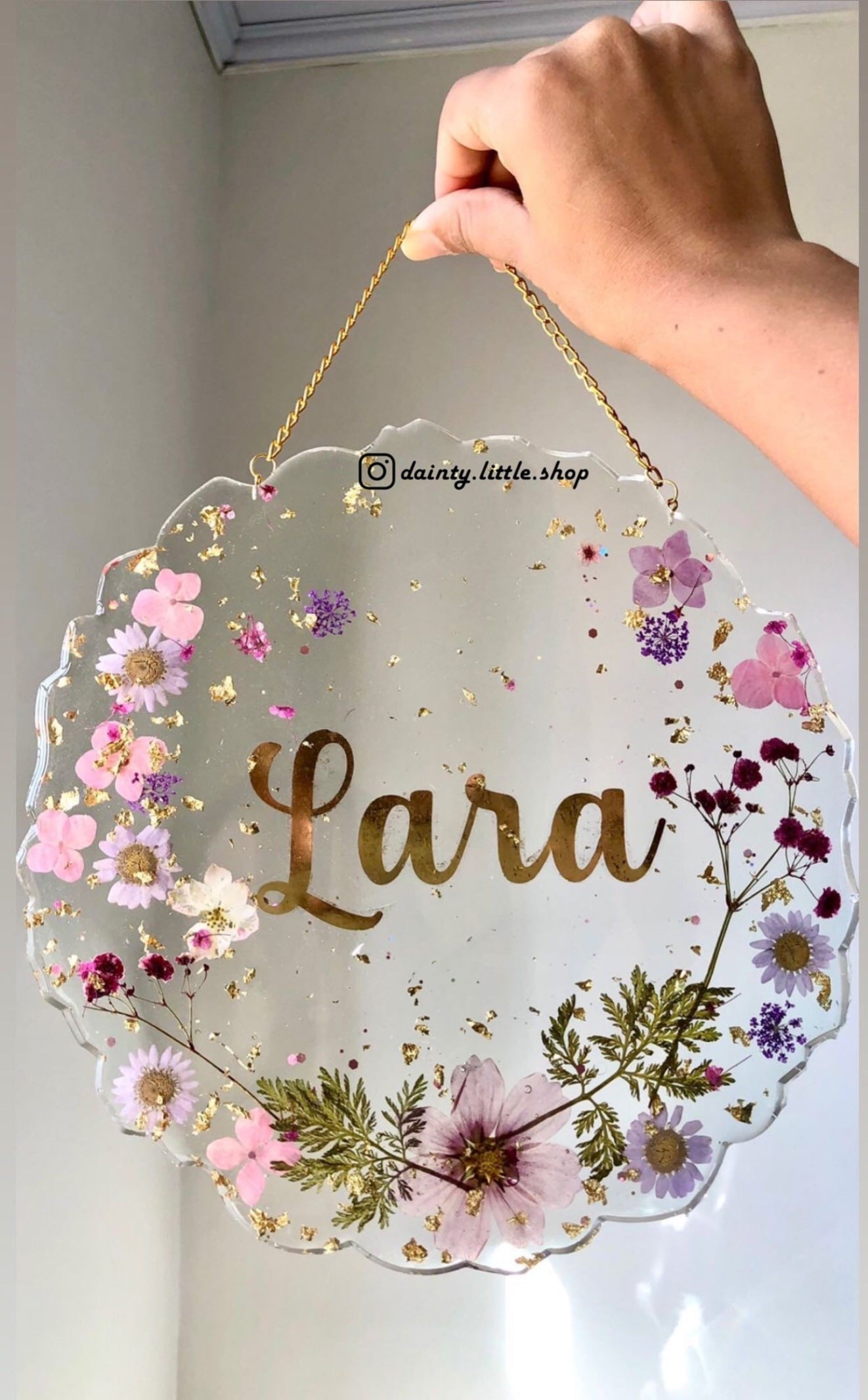 Handmade with real pressed flower, and features an 18K gold plated chain, this luxury and beautiful wall hanging is a one-and-only décor piece to display around your lovely home.