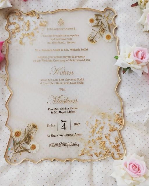 Elevate your special day with our customised wedding invitation card. Made with handmade resin, this exquisite invitation adds a unique touch to your invitations. Each one carefully crafted for a luxurious and tasteful experience. Perfect for the discerning couple ready to make a statement. Handmade wedding invitation card - We memorialise your invitation, save the date, and any other cards in this beautiful resin card.